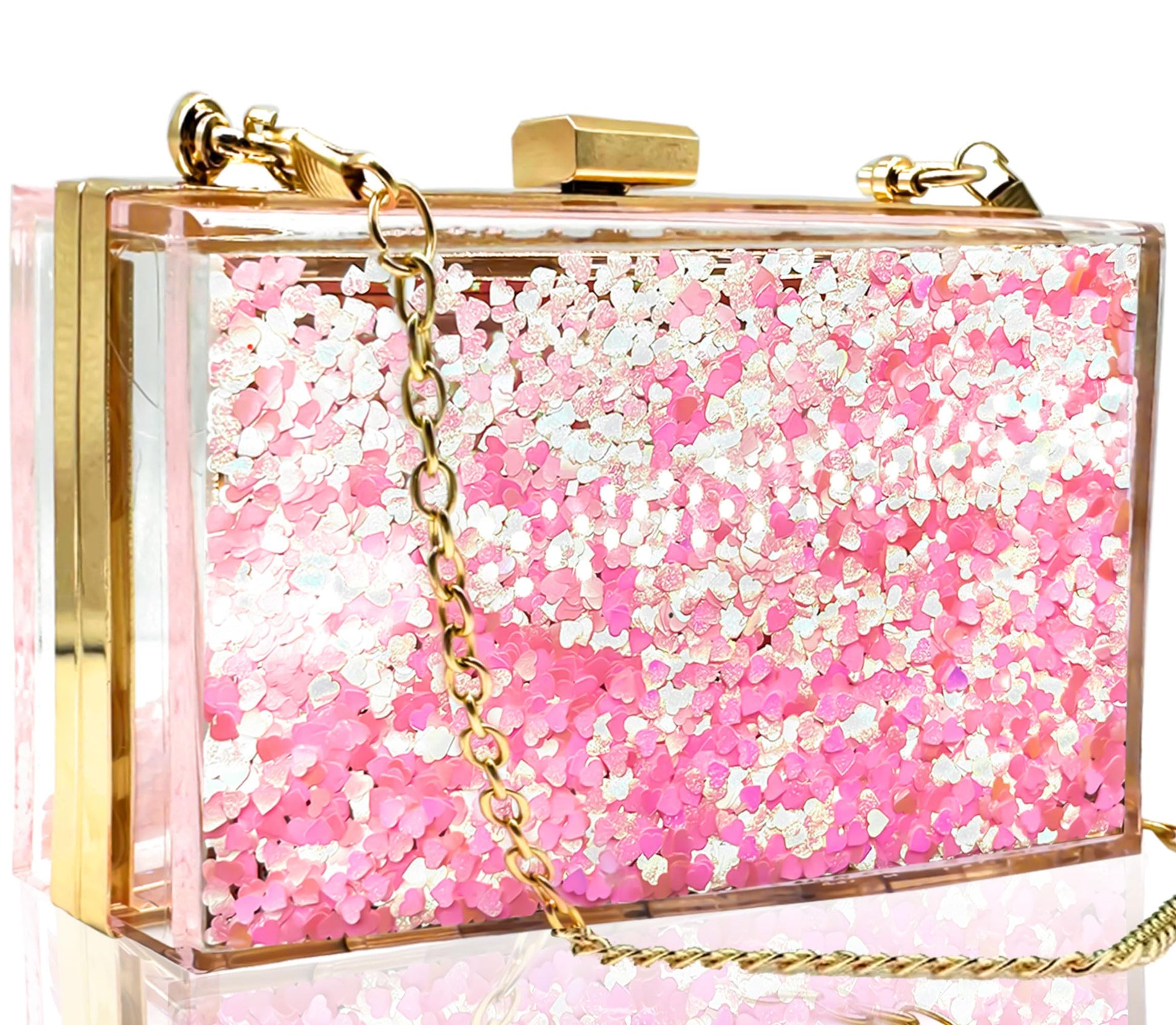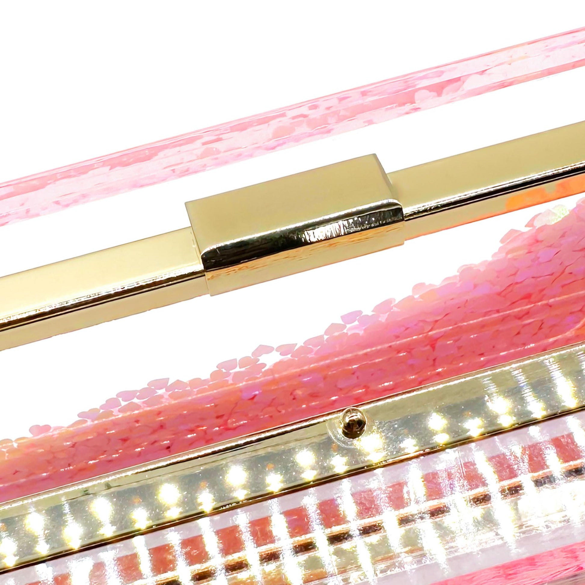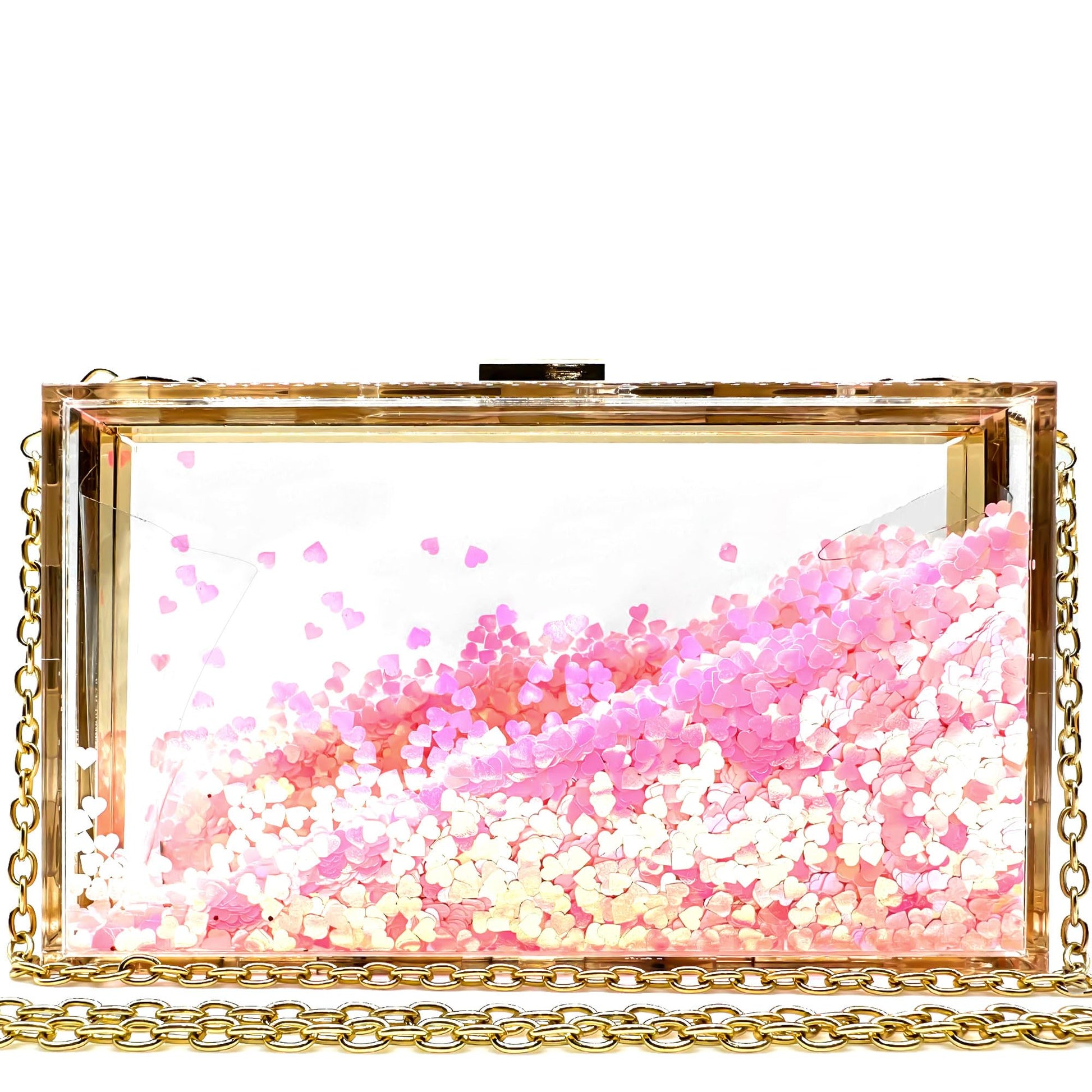 - Glittering Evening Bags Popular Design: detachable, and comes with detachable golden cross-body strap,structured clear box clutch with moving sequins detail.