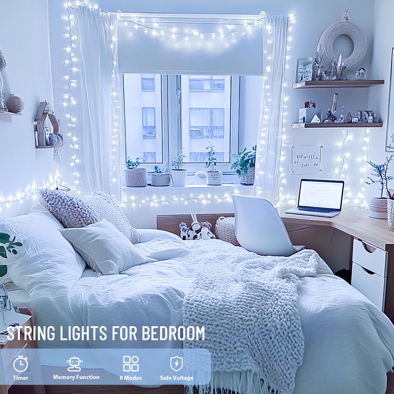 - 8-Modes & Timer White String Lights: Our white lights string have 8 modes to choose from, such as steady on, flashing, etc. You can switch by briefly pressing the button on the plug to create a personalized effect. Versatile lights can play a role in Christmas, Halloween, parties or daily decorations, adding more romance to your life. Press and hold the button on the led string lights plug for three seconds to turn on for 6 hours and turn off for 18 hours