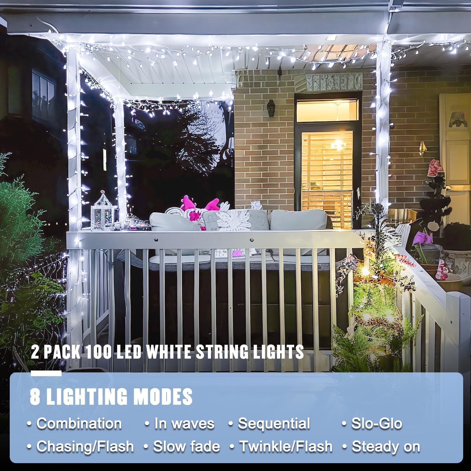 JMEXSUSS 2 Pack 100 LED White Christmas Lights Indoor, 33ft 8 Modes White String Lights Indoor Outdoor Connectable, Clear Wire Christmas String Lights for Bedroom Tree Xmas House Party Decorations
