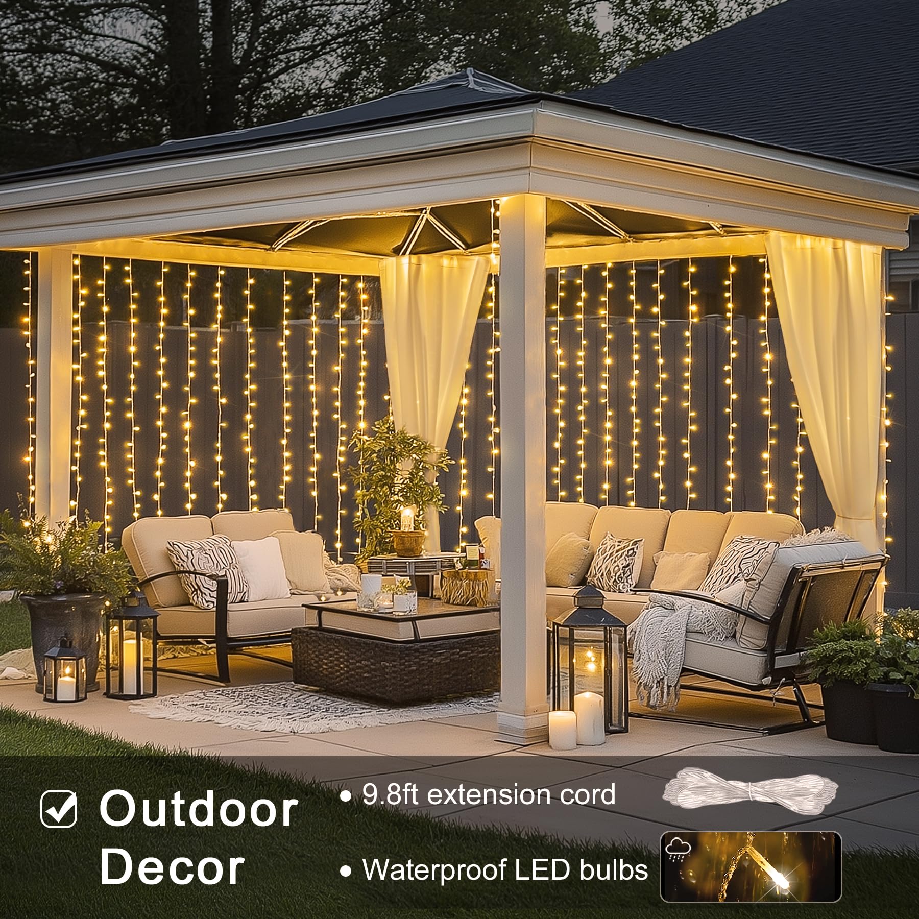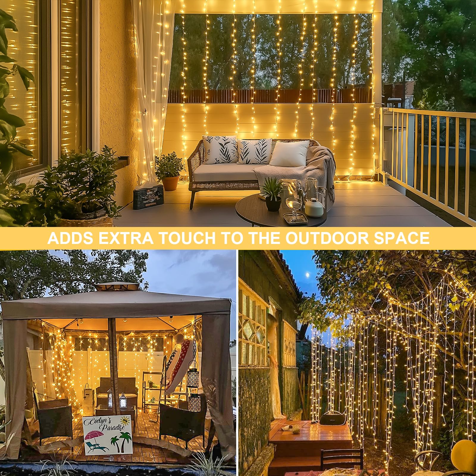 - Great Decoration for Your Home: Our outdoor curtain lights are IP44 waterproof and can withstand rain and snow. The 9.8ft lead wire supports more help for outdoor use. It's great for Diwali, Xmas, Ramadan, birthday parties, weddings, backdrops, or holiday decor. It is also ideal for daily use, such as hanging on bedroom tapestries, doors, walls, windows, pergolas, patios, trees, etc. If there are problems with our Christmas lights, please contact us, we will offer a return or refund service.