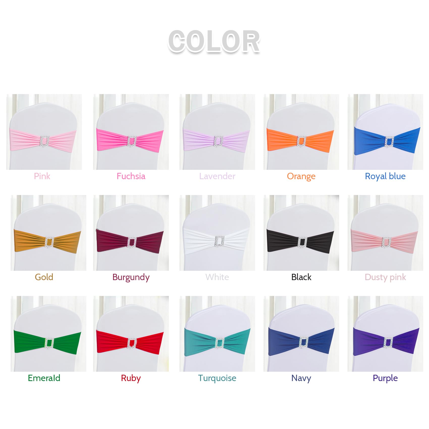 - MATERIAL:Sash(90% Polyester & 10% Spandex ), Buckle(100% Plastic).The white chair covers are not included.