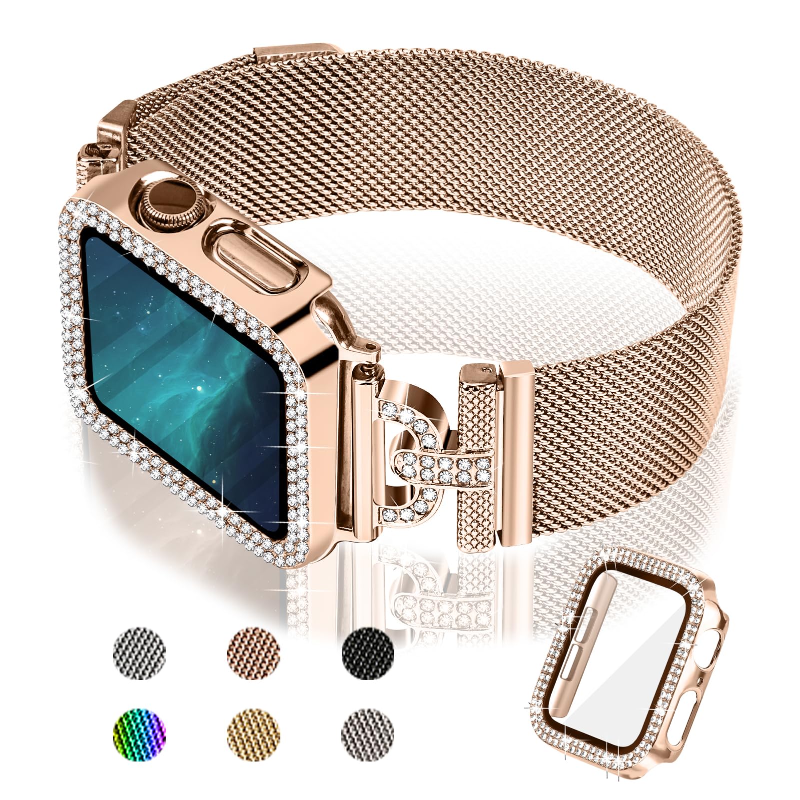 Joyozy Magnetic Band Compatible with Apple Watch Band 38mm 40mm 41mm 42mm 44mm 45mm 46mm Milanese Strap with Bling Case and Screen Protector, Dressy Stainless Steel iWatch Loop for Women (Rose Gold 40mm)