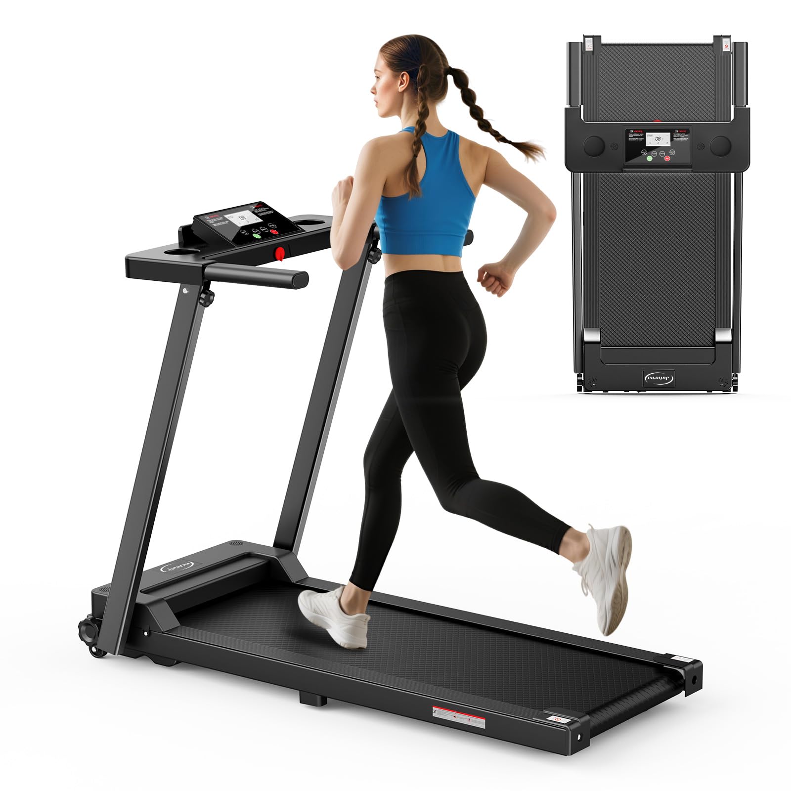 - Juturna treadmills for home comes with knobs and mobility wheels for easy folding, moving and storage. Total dimensions when folded are only 48 L x 22 W x 5.5 H inches. The running belt is made of multi-layer non-slip textured material.