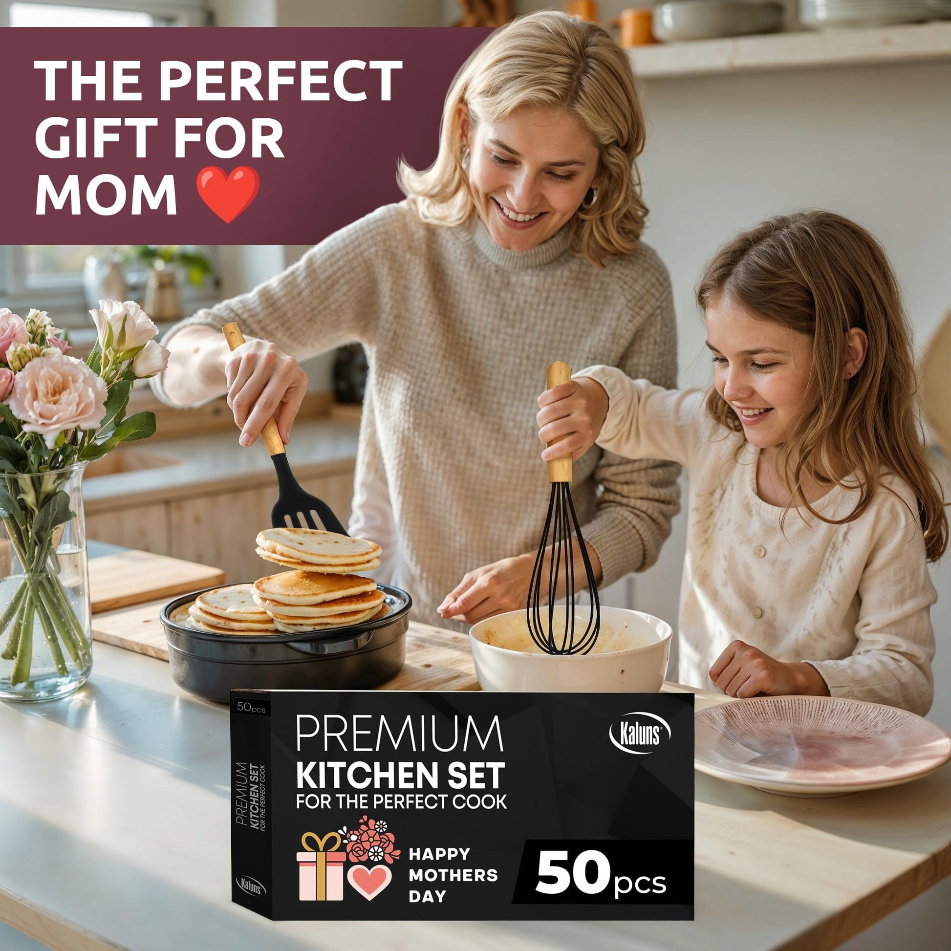 Kaluns 50 PCS Silicone Kitchen Utensils Set Complete Kitchen Set - 800°F Heat Resistant Non-Stick Premium Silicone Cooking Utensils W Wooden Handles - Can Opener, Masher, Turner, Silicone Spatula Set