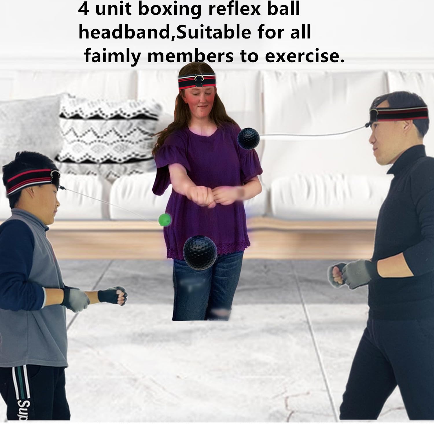 - 2,Boxing reflex ball headband for kids and adults. It is suitable for parent-child interactive sports, physical exercise and training the reaction speed of hands and feet. Fix the other end of the rope on the boxing reaction ball on the headband, adjust the length of the number, and wear gloves.