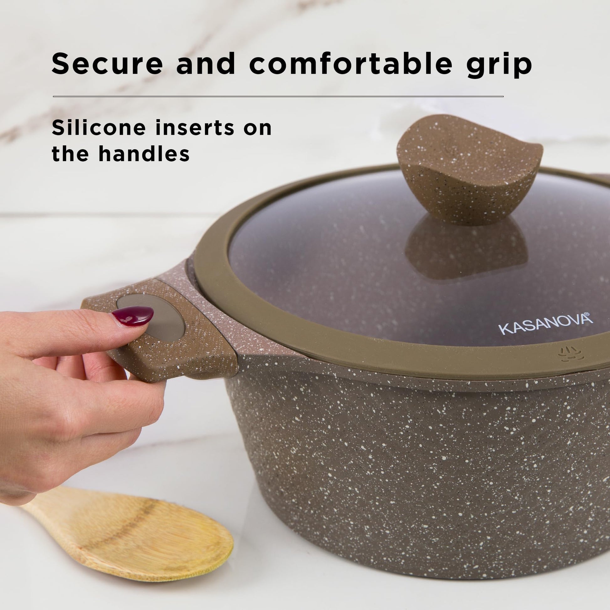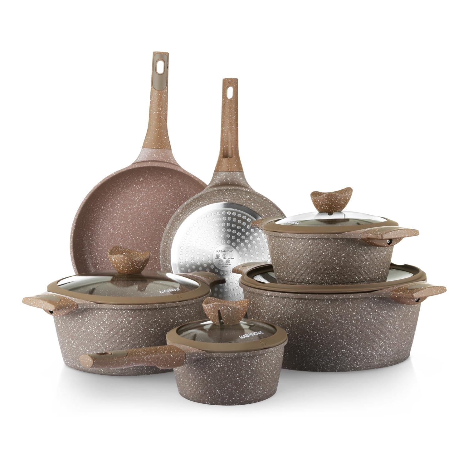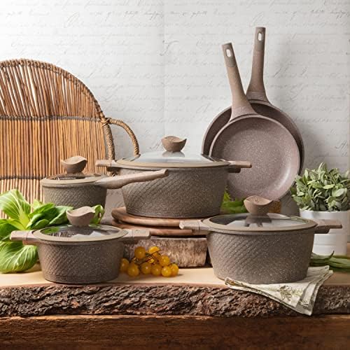 KASANOVA Pots and Pans set for cooking nonstick, 10Pcs, Durable Aluminum cookware set, PFOA-free, Kitchen pans set with glass lid, Induction safe, Taupe (10)