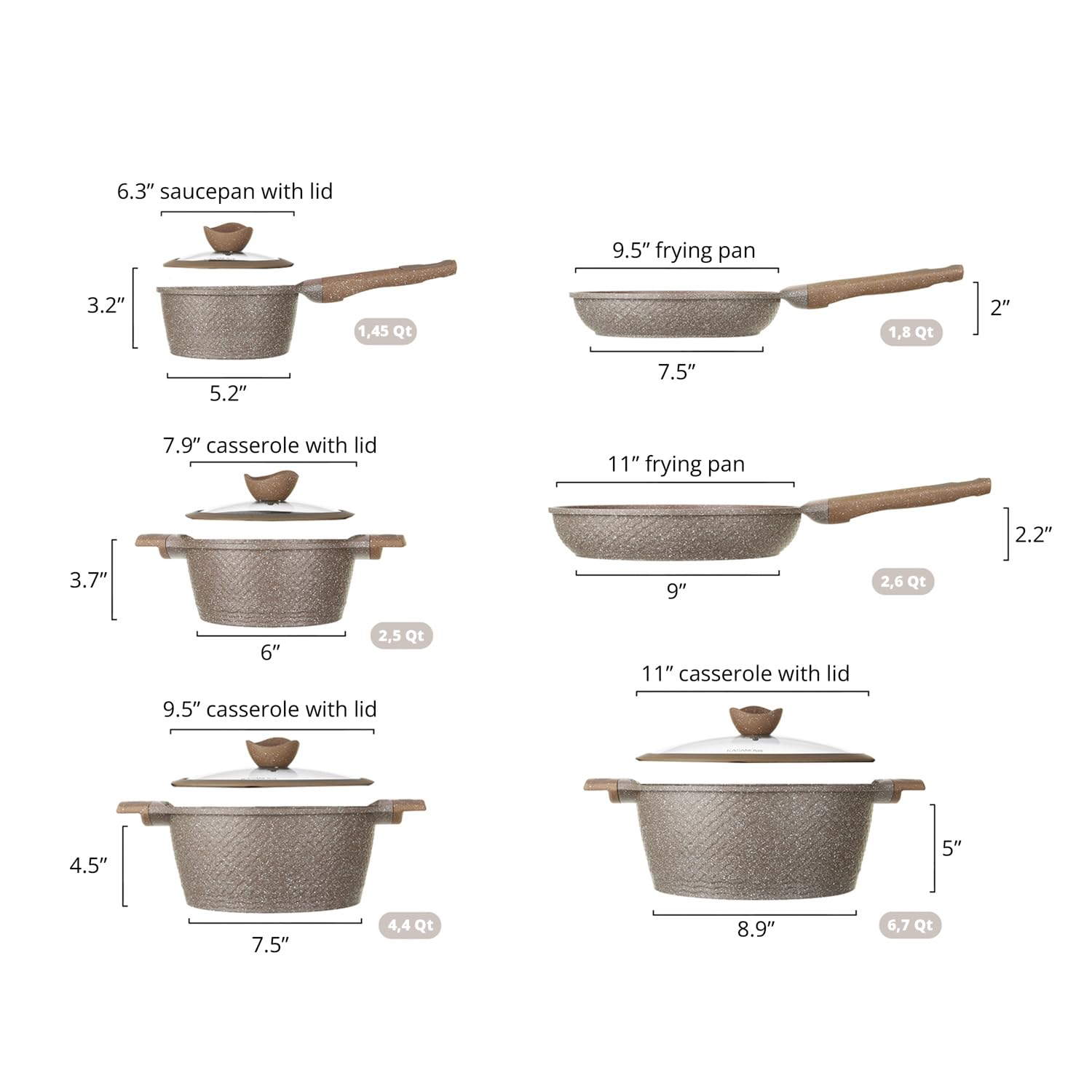 - [SET INCLUDES]: all you need to cook every meal with this 10PCS set: 7.5’’ frying pan, 9’’ frying pan, 1.45QT saucepan with lid, 2.5QT casserole with lid, 4.4QT casserole with lid, 6.7QT casserole with lid.