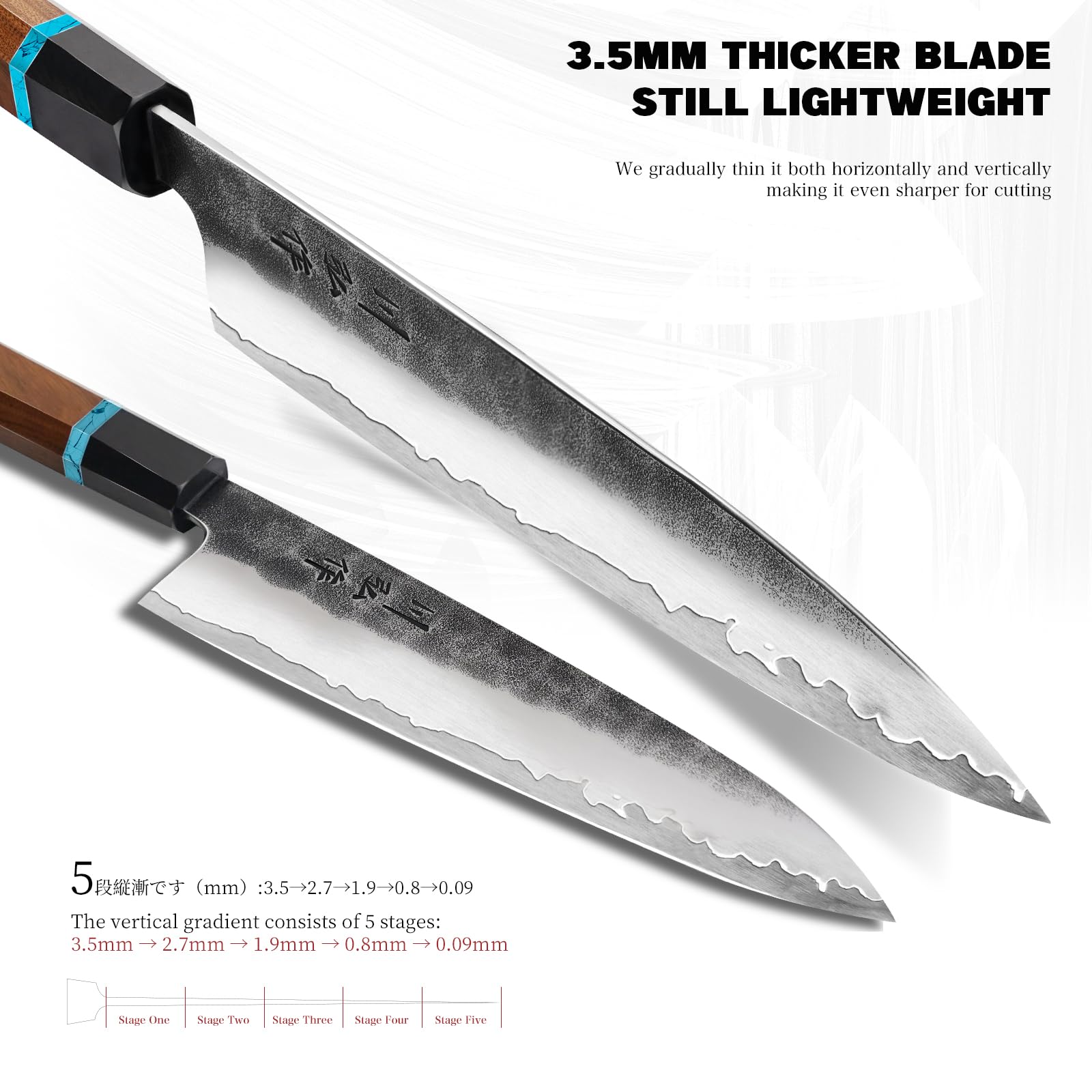 - 【Crafted for Uncompromising Performance】At the heart of our exceptional kitchen knives is the premium quality of the materials used in their construction. Forged from the finest finest 3-layer composite steel with Japan VG10 Stainless Steel, the razor-sharp blades combine exceptional hardness and edge retention for lasting sharpness.