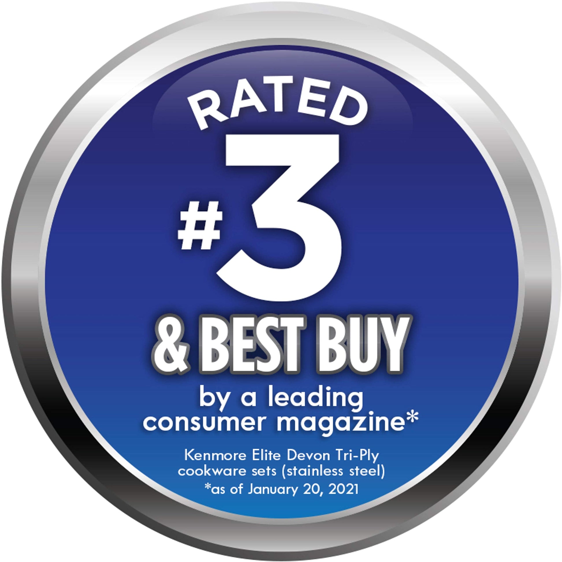 - DEVON: Rated 'Best Cookware Sets of 2021' by a leading consumer magazine. The Kenmore Devon Stainless Steel 10-Piece Cookware set. This stainless-steel cookware is PTOE, and PFOA free allowing for healthy cooking in your household. The set is compatible with gas, electric, glass, and induction stove tops, as well as being oven safe. The Dutch Oven and Sauté Pan include capacity markings, making your measurement easy to read. With double riveted handles and tempered glass rims.