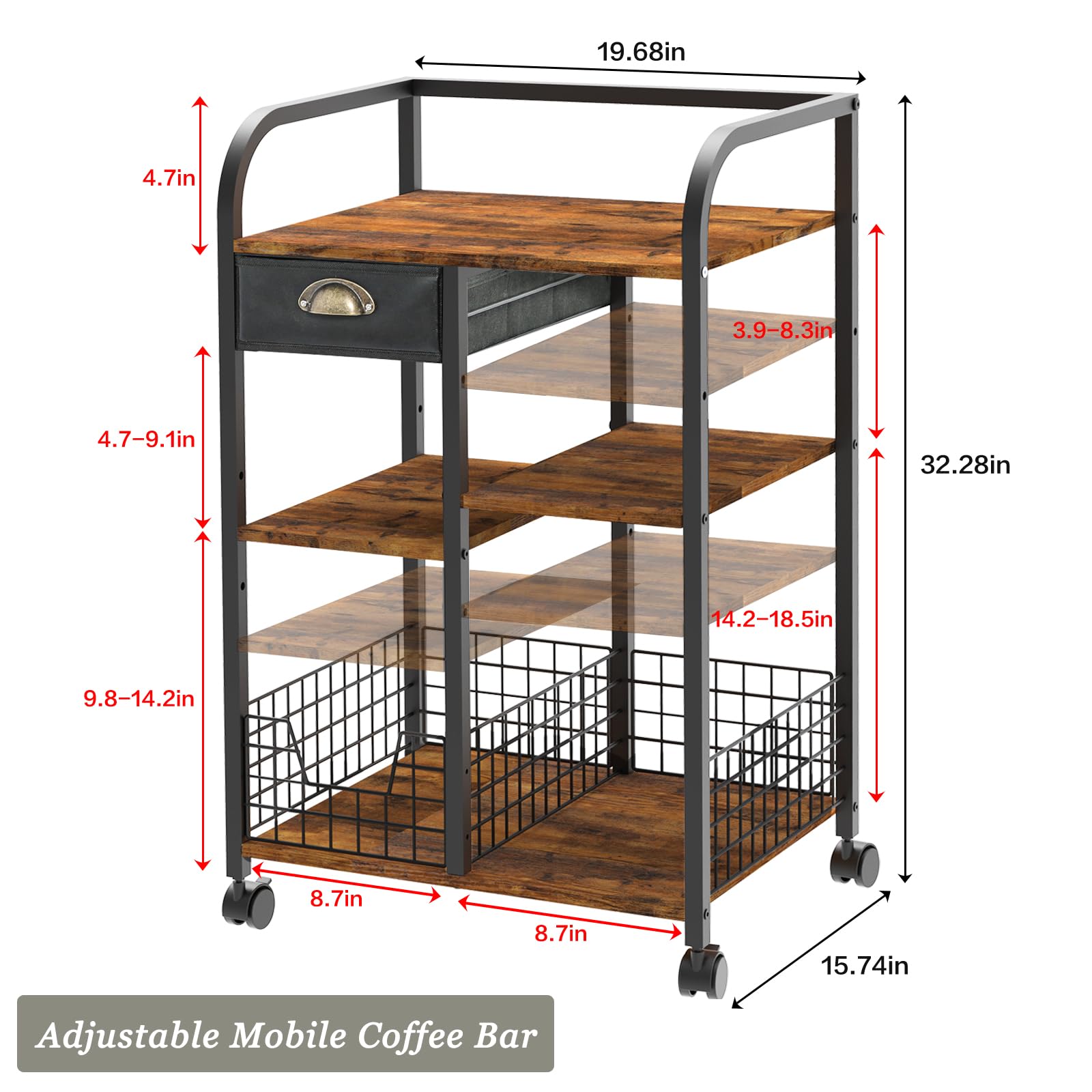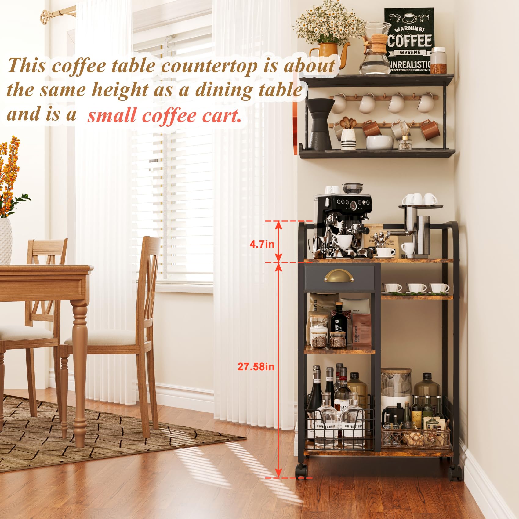 keomaisyto Coffee Cart with Storage Drawer, Coffee Bar Cabinet with Wheels, 4-Tier Adjustable Mobile Coffee Table, Rustic Wood Coffee Bar Station for Kitchen/Entrance/Living Room/Dining Room