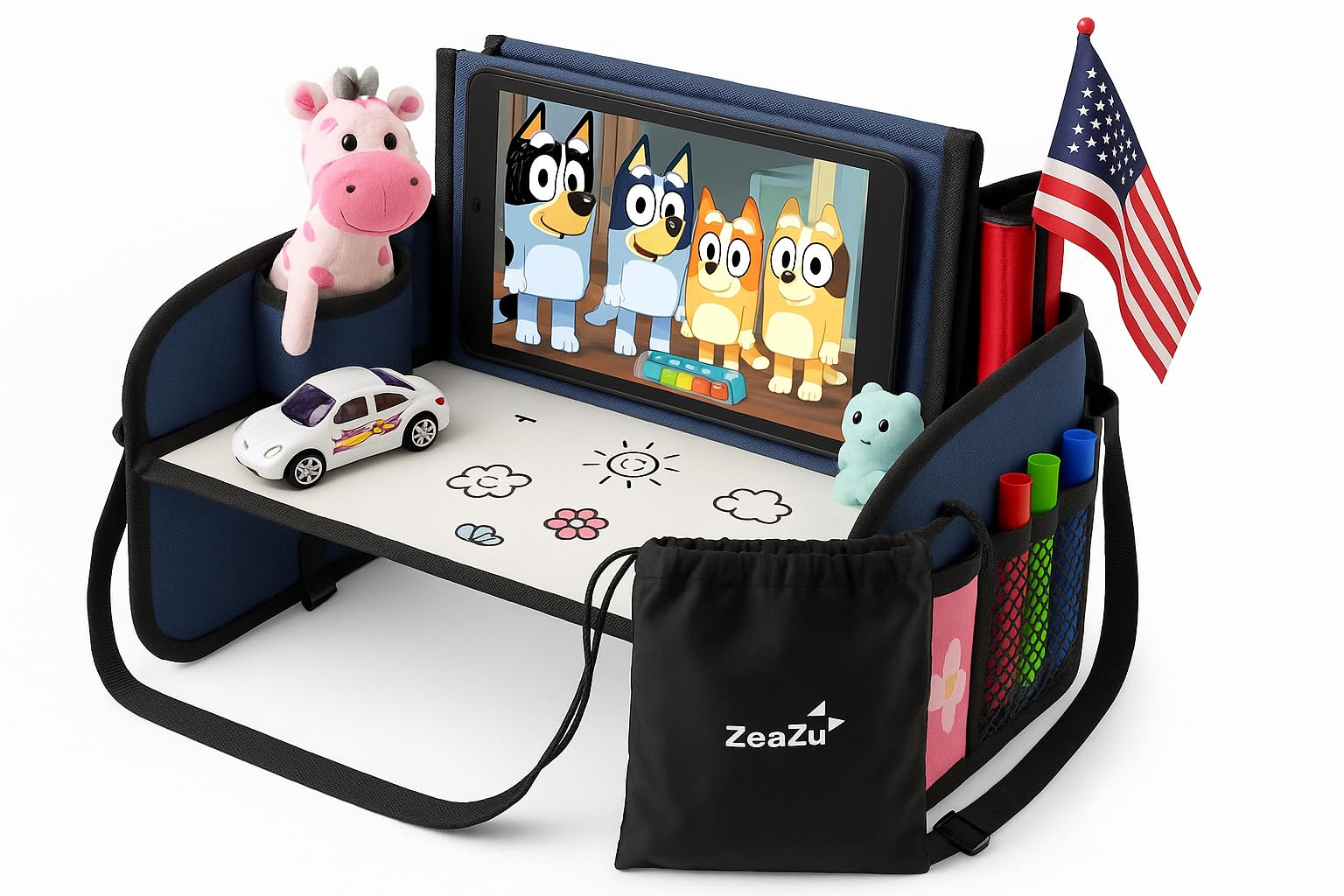 Kids Travel Tray - Foldable Toddler Lap Desk with Dry Erase Board, Car Seat Tray for Toddler, Waterproof Lap Tray for Airplane Kids Travel Essentials for Road Trip Activities, Silver