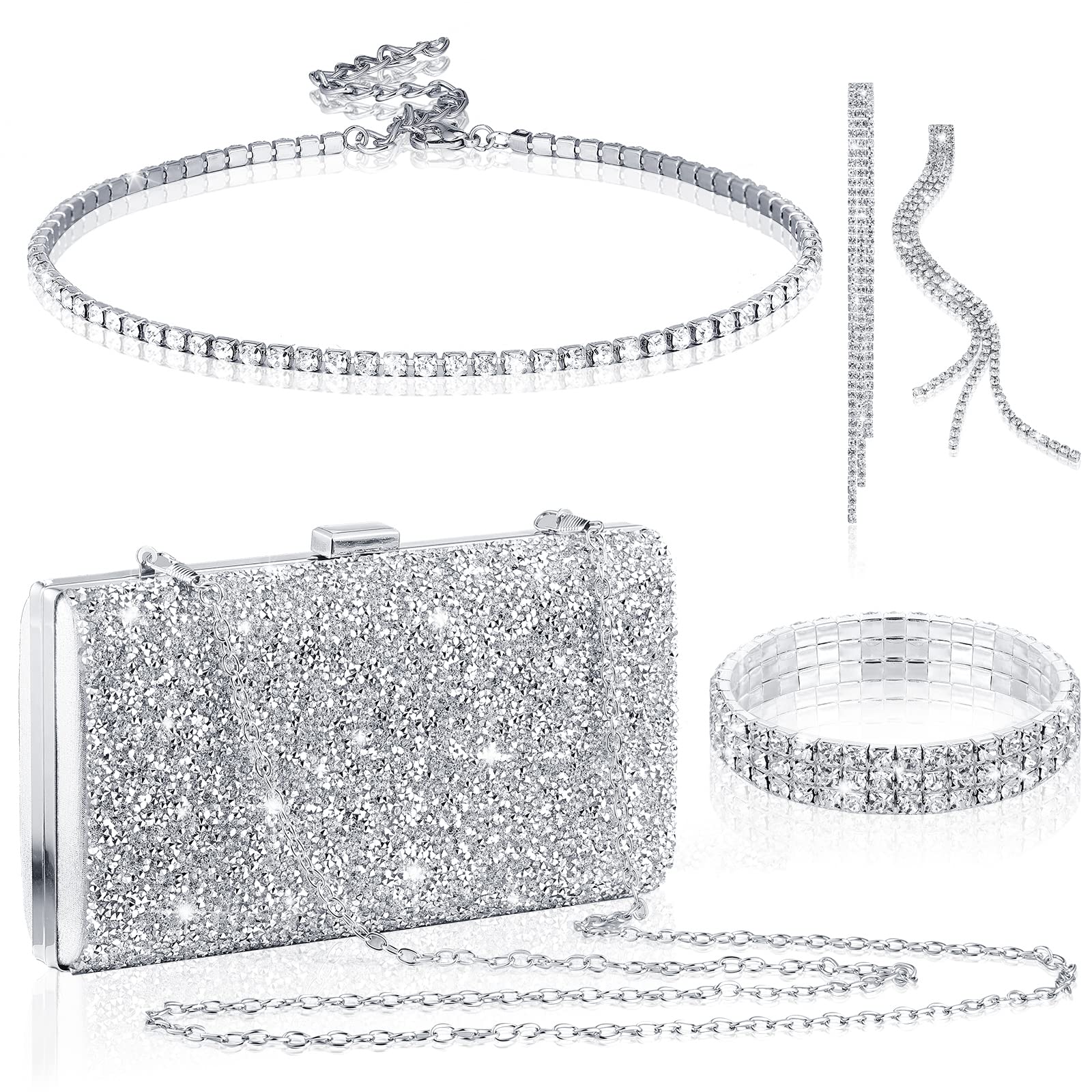 Kigeli 4 Pieces Women Rhinestone Evening Clutch Bag Bling Earring Necklace Bracelet for Wedding Formal(Silver)