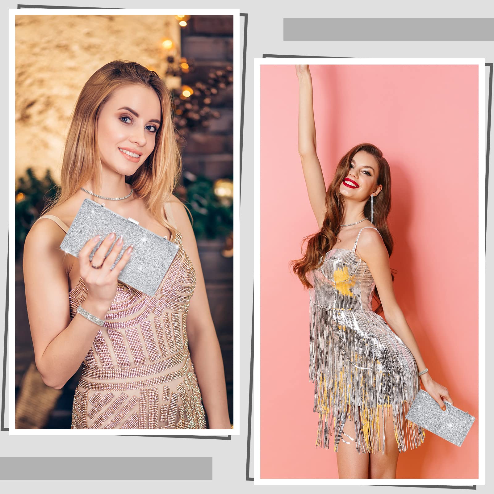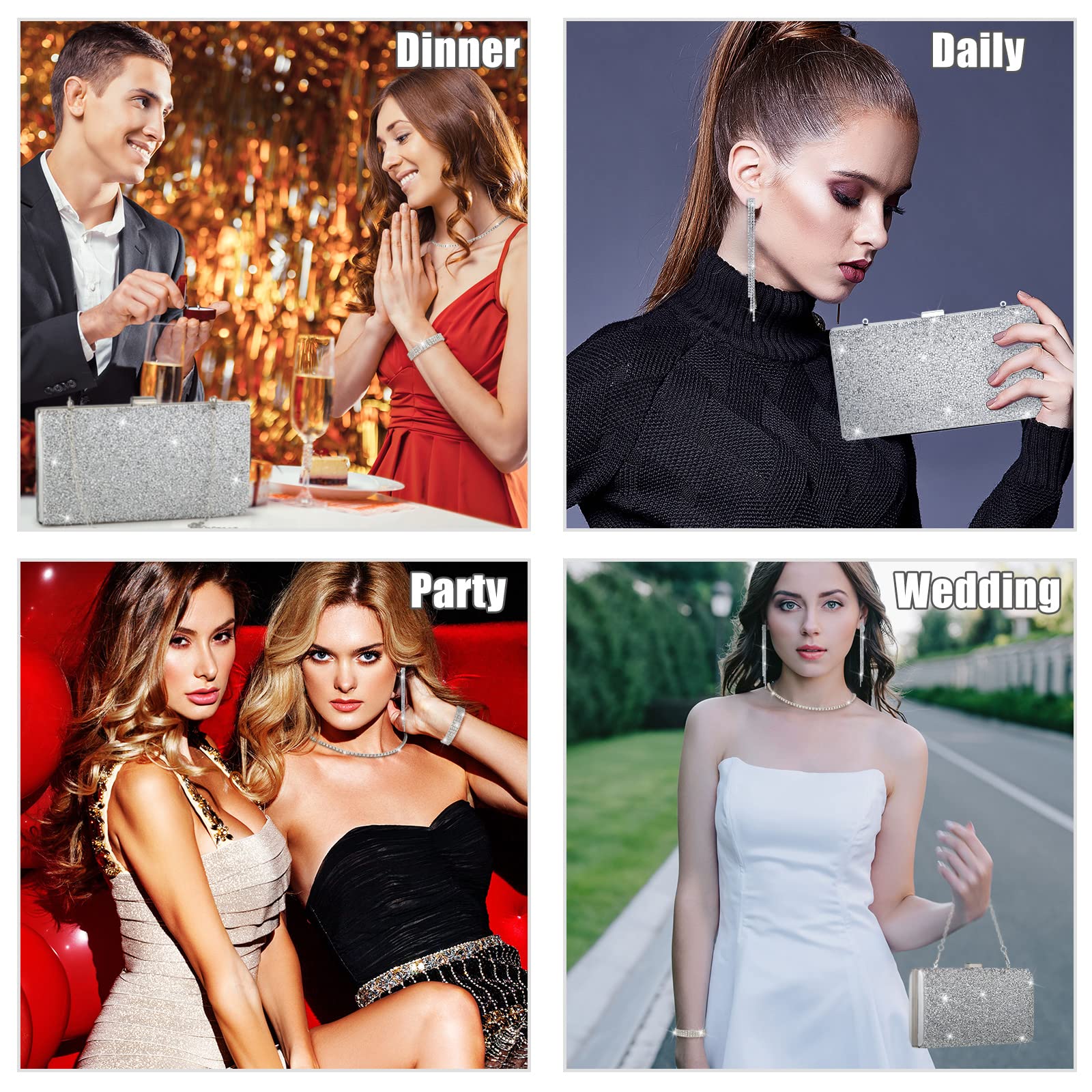 - Party Jewelry Set: the accessory sets for women will provide you with 1 piece of rhinestone clutch purse, 1 piece of glitter necklace, 1 piece of crystal bangle and 1 pair of dangle earring, an exquisite combination to meet your wedding party dress needs