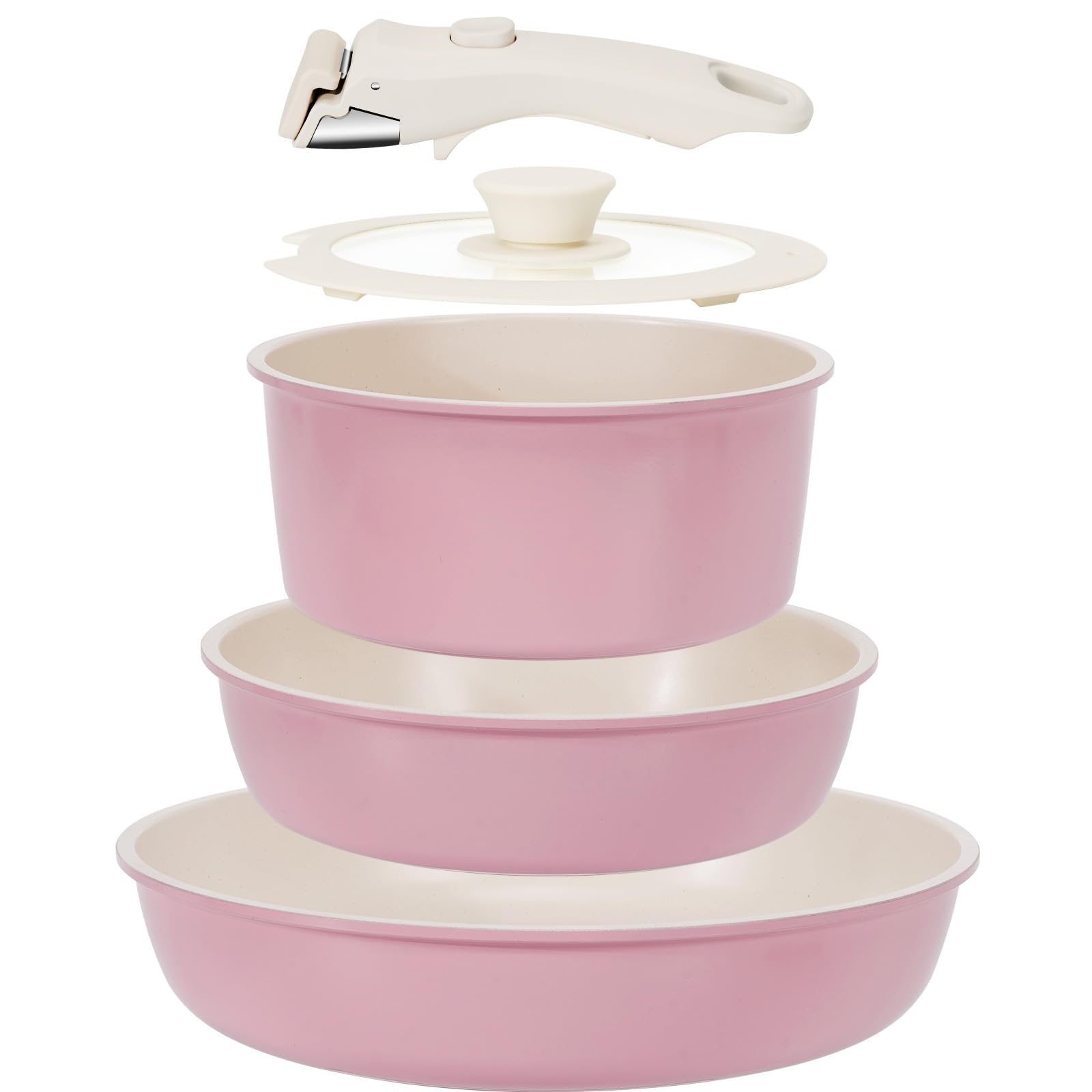 KIKCOIN 5 Pack Ceramic Pots and Pans Set Non Stick, Kitchen Cookware Set Detachable Handle, Non Toxic Cooking Set with Removable Handles, Induction Dishwasher/Oven Safe, Ollas de Cocina, Pink