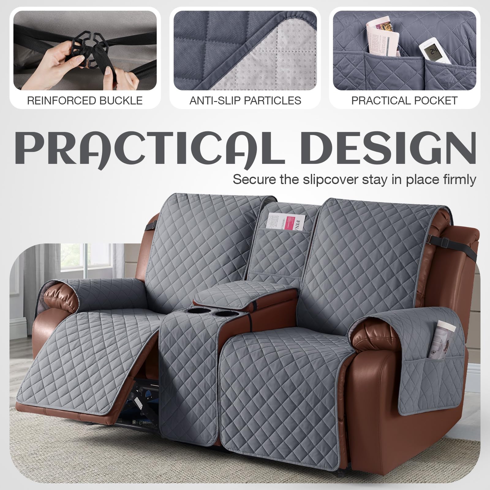 KinCam 100% Waterproof Recliner Loveseat Cover with Console, Non-Slip Reclining Couch Covers for 2 Seat, Recliner Sofa Cover Furniture Protector with Elastic Straps for Kids, Pets, Dark Gray