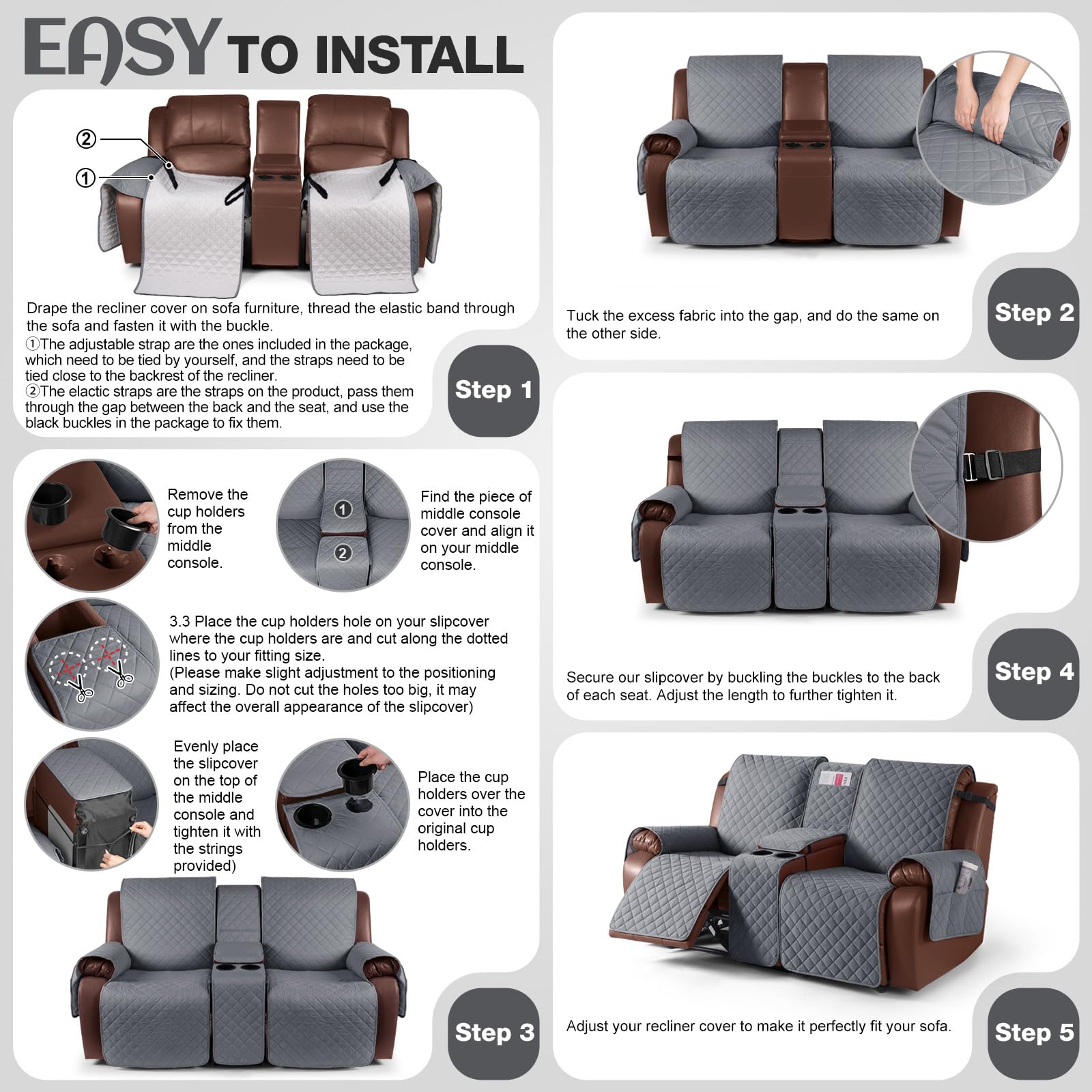 - Multiple Size Options: Our 2 seat recliner cover are suitable for loveseat recliner with the width of 48” (23.6' each seat size and 11.4' console cover size). The separate design of the center console cover is more suitable for installing different recliner sofa covers. Please measure the size of your sofa before purchase, follow the Instructions to make sure that our sectional sofa covers can match your sofa