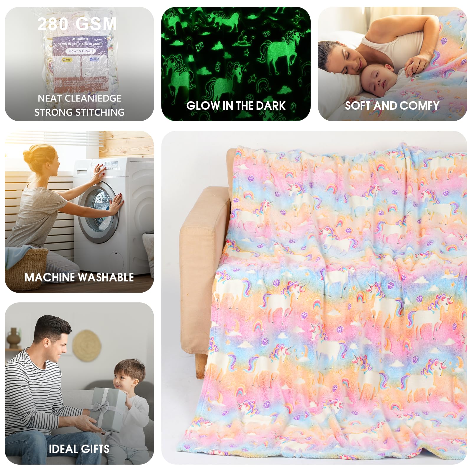 KIRMIKU Glow in The Dark Blanket Unicorns Gifts for Kids, Soft Unicorns Blanket Gift Toys for Toddler Girls Age 2-16 Birthday Christmas 50""x60"", A0003