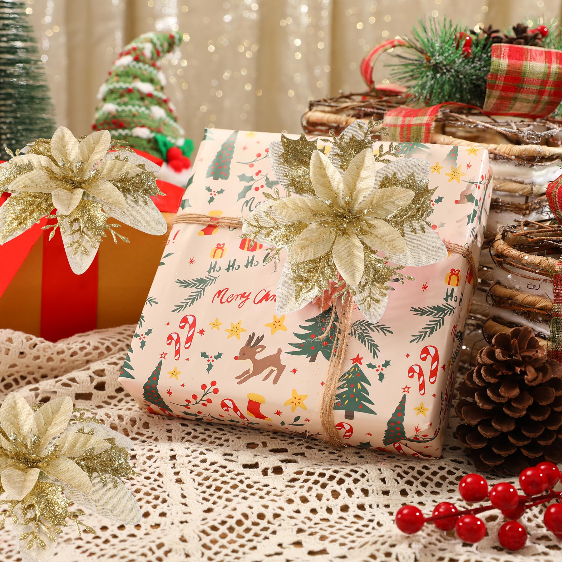 - Package Include: 24 Christmas glitter gold poinsettia flowers, 24 metal clips and 24 stems