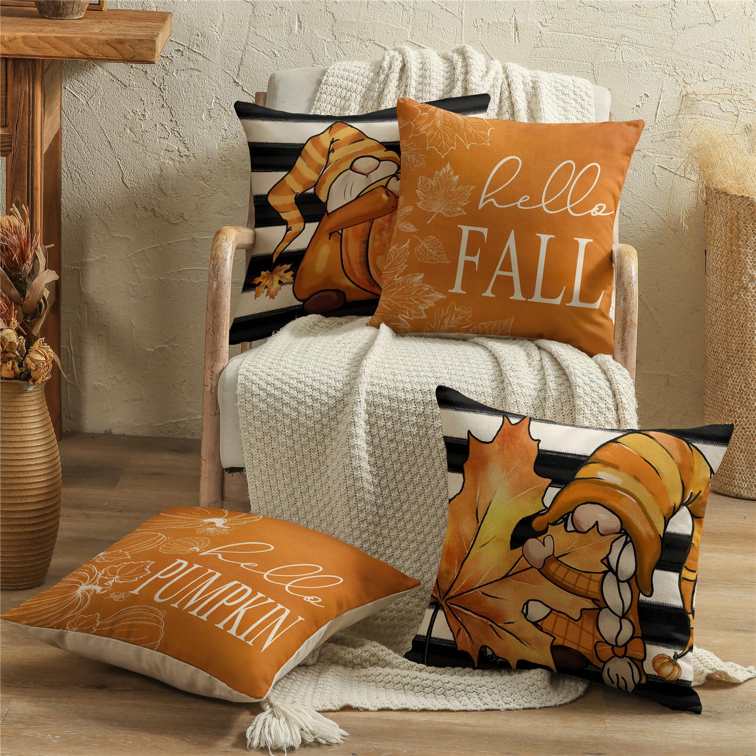 KISVODS Fall Pillow Covers 18x18 Thanksgiving Farmhouse Decorations Black Striped Maple Leaf Pumpkin Outdoor Fall Decor Throw Pillow Covers Gnomes Autumn Harvest Cushion Case for Sofa Couch Set of 4