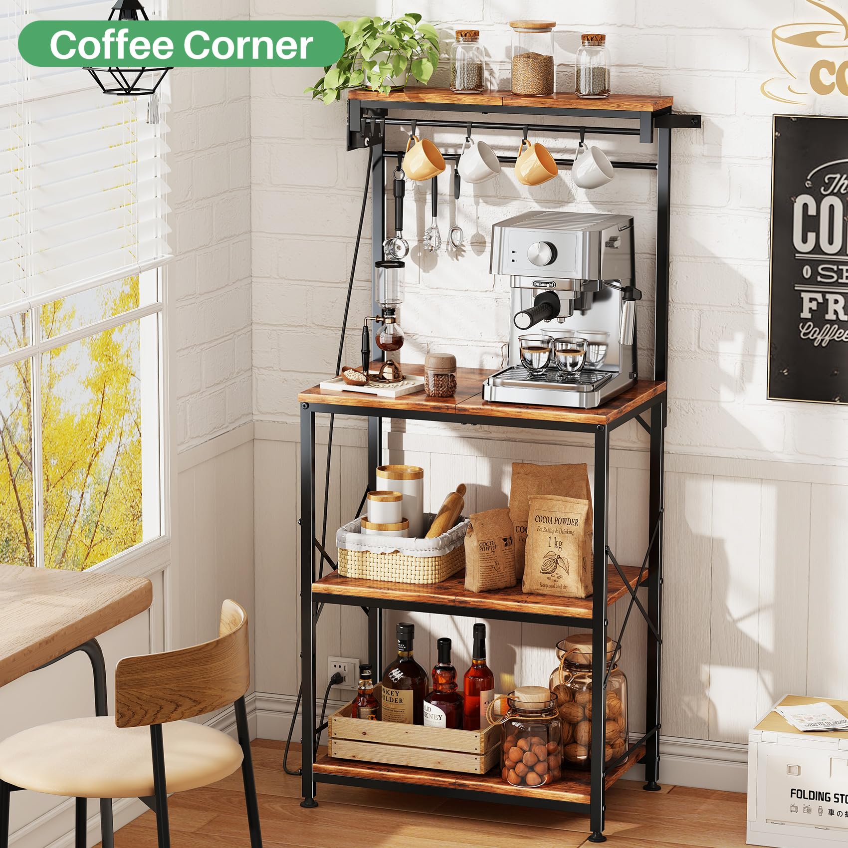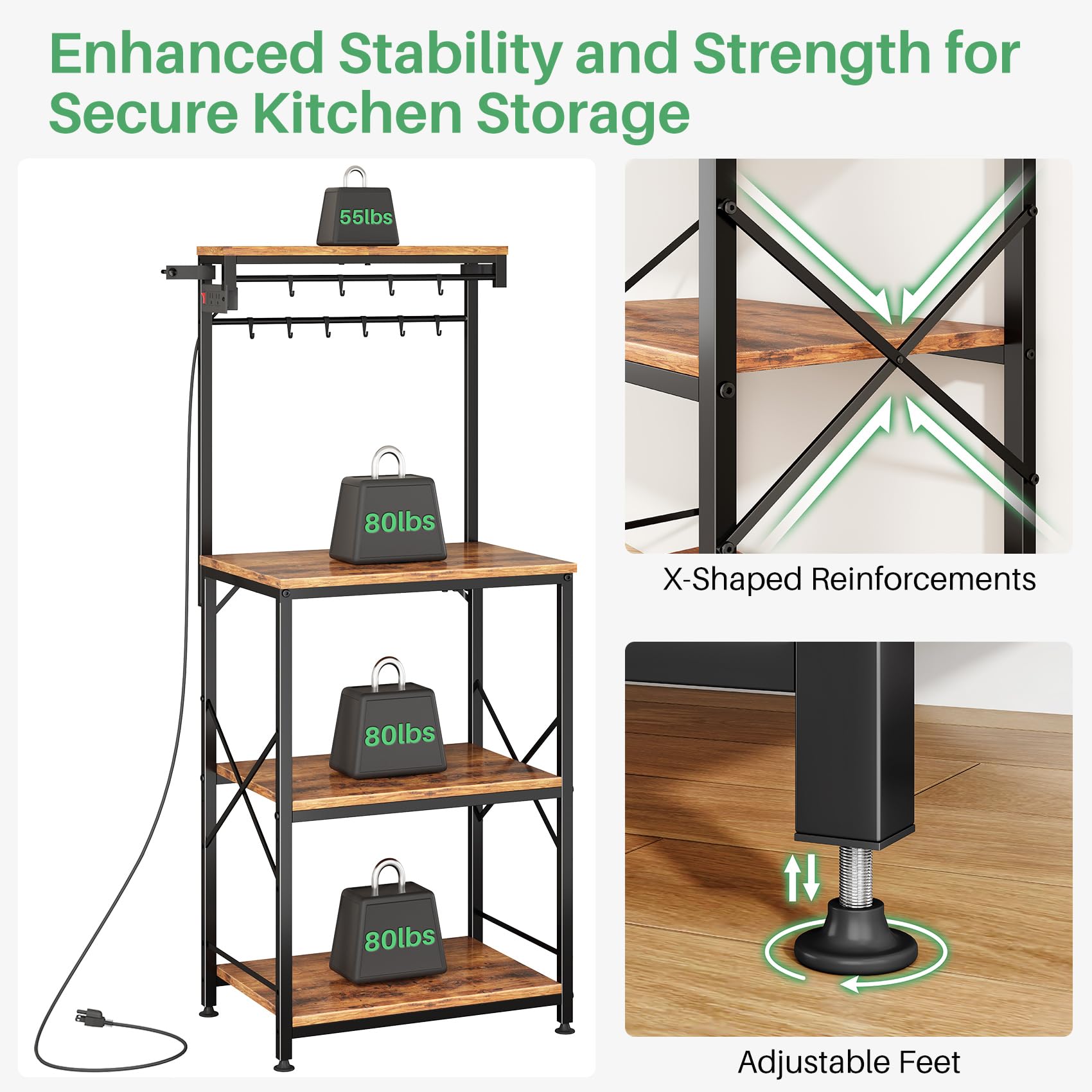 Kitchen Bakers Rack with Power Outlet 10 Hooks, 4 Tiers Coffee Bar Station Cabinet, Microwave Stand with Storage (Rustic Brown, 21.7 x 14.2 x 49.6 Inch)