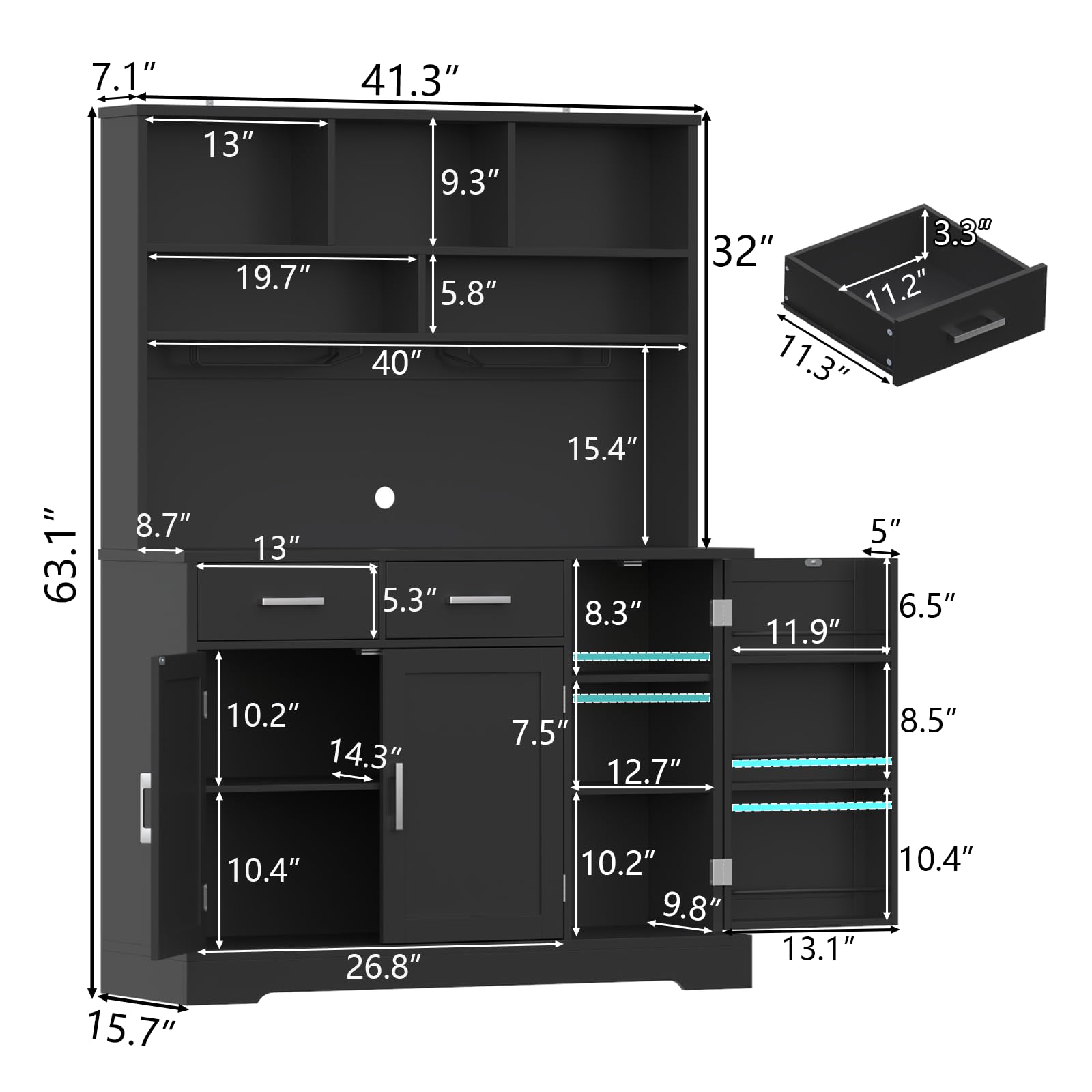 - [Large Pantry Cabinets for Kitchen Storage]-This kitchen hutch offers 10 compartments, 2 adjustable shelves and 2 rows of goblet holders, perfect for storing items of various sizes, keeping essentials organised. The spacious countertop and 2 smooth-gliding drawers can accommodate often-used items for easy access. It also includes a 3-layer door-side storage rack, perfect for spices, seasonings, and small items, streamlining kitchen organisation. A hole in the back helps you manage the wires.
