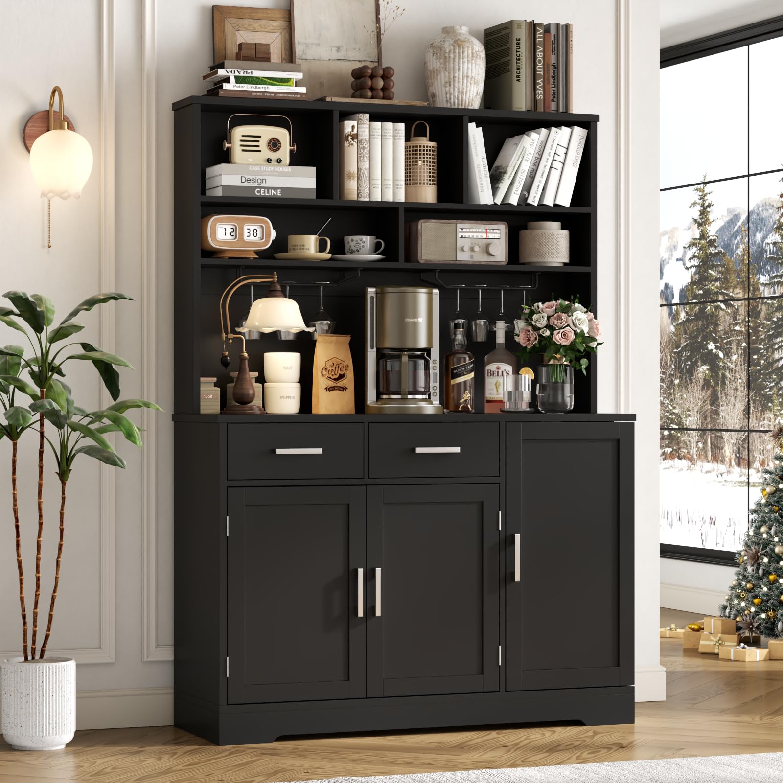 - [Modern Pantry Cabinet with Hutch]-This coffee bar tall pantry cabinet with goblet holders & adjustable shelves is designed a simple black finish, clean and smooth lines, three-dimensional door frames, and silver handles add a touch of elegance and sophistication, complementing the clean black finish perfectly, emanating a touch of minimalist aesthetic, adding a charming and modern touch to any dining room or living area.