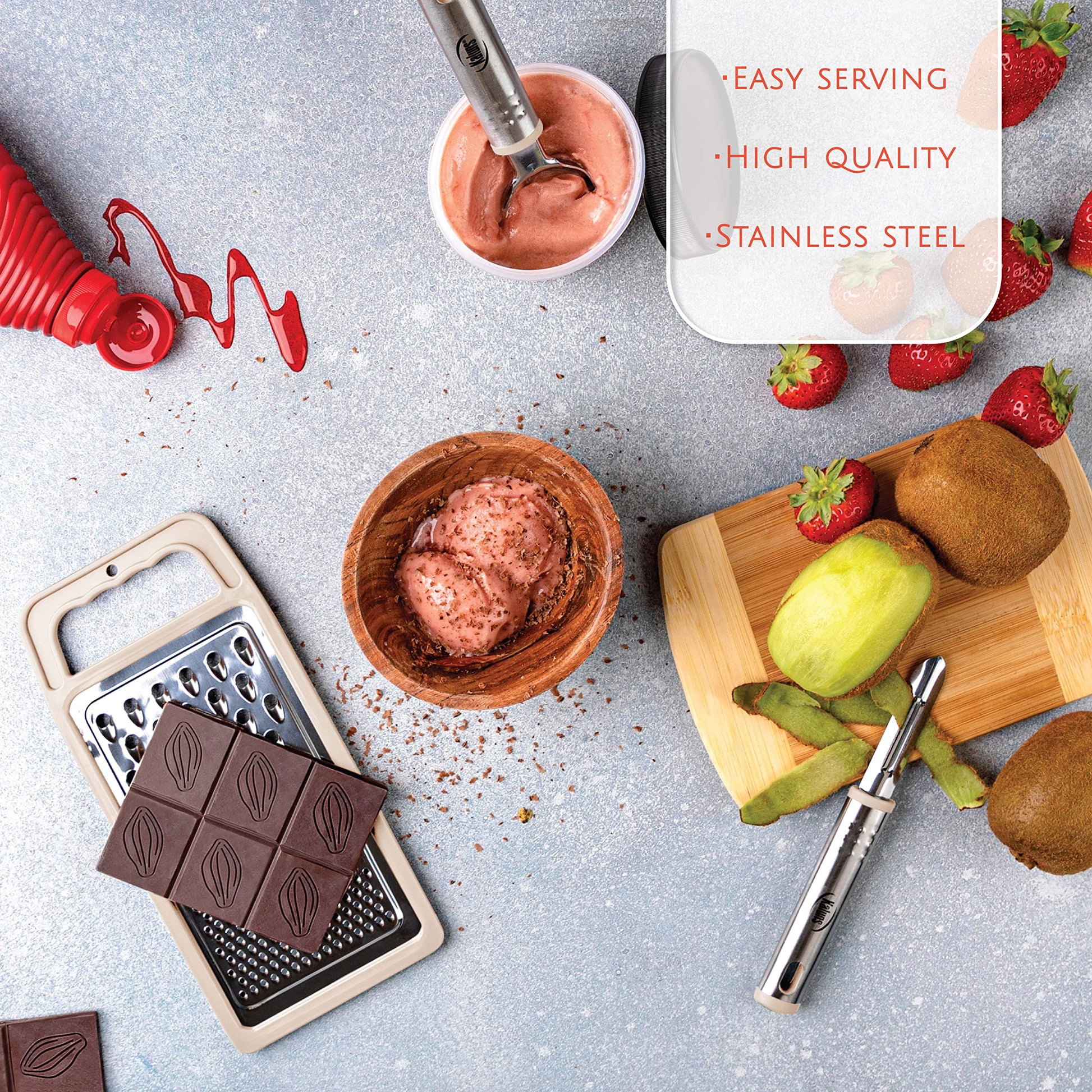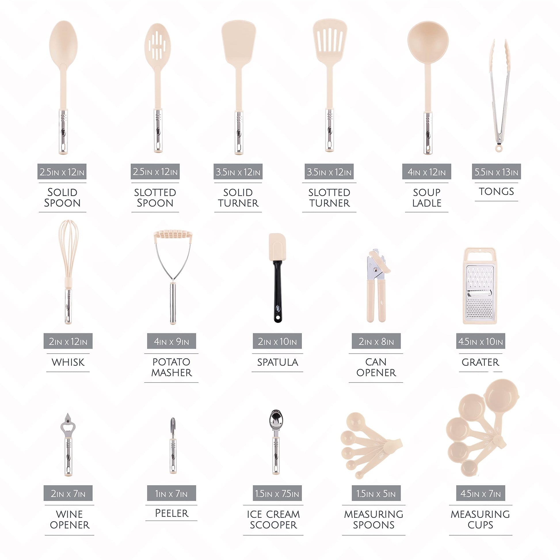 - Cooking Utensils Set Includes: Soup Ladle, Solid Spoon, Slotted Spoon, Solid Turner, Slotted Turner, Potato Pusher, Whisk, Can Opener, Grater, Spatula, Tongs, Ice Scream Scooper, Wine Opener, Peeler, Measuring Cups, Measuring Spoons.