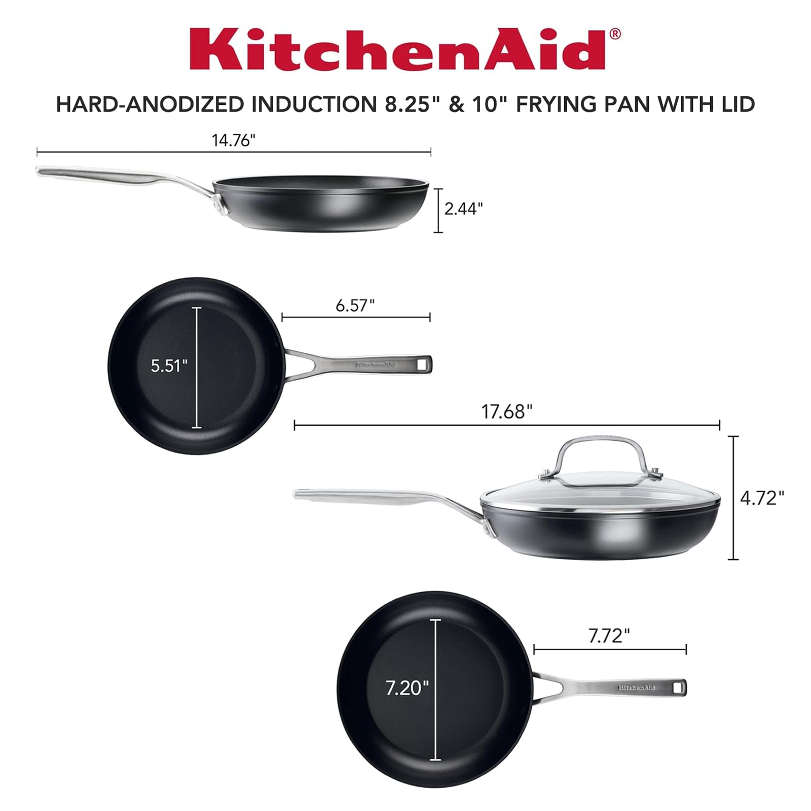 KitchenAid Hard Anodized Induction Nonstick Frying Pan Set With Lid, 3-Piece – 8 & 10 Inch Skillets, Durable, Even Heating, Dishwasher & Oven Safe, Easy-Clean, Matte Black
