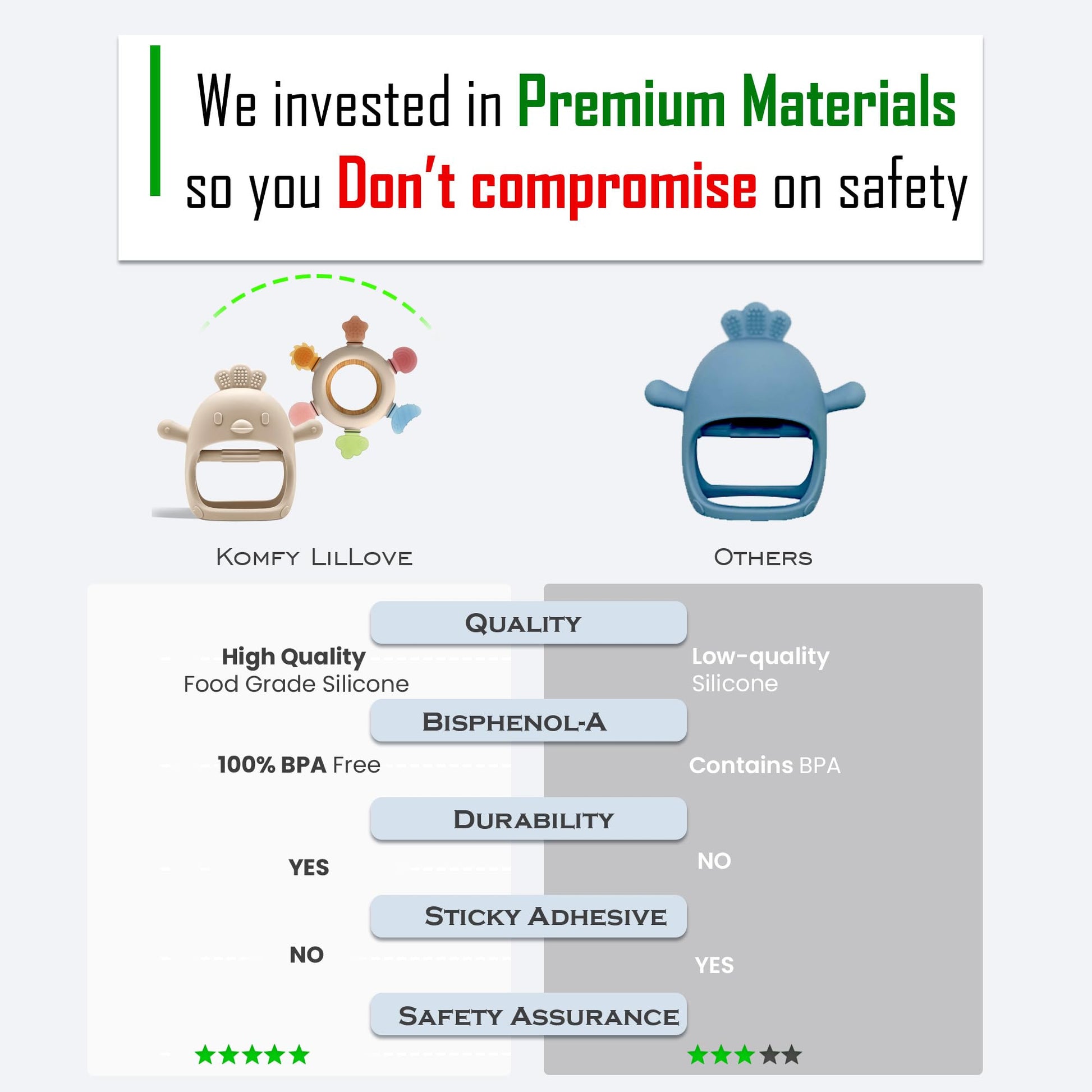 - Supports Natural Teething Development: If your baby is drooling more than usual or feeling irritable, they might be starting to teethe. Komfy LilLove silicone baby teether for 0–6 & 6–12 months satisfy their natural chewing reflex, helping ease gum pressure and provide comfort. The textured surfaces encourage healthy oral development as new teeth emerge.