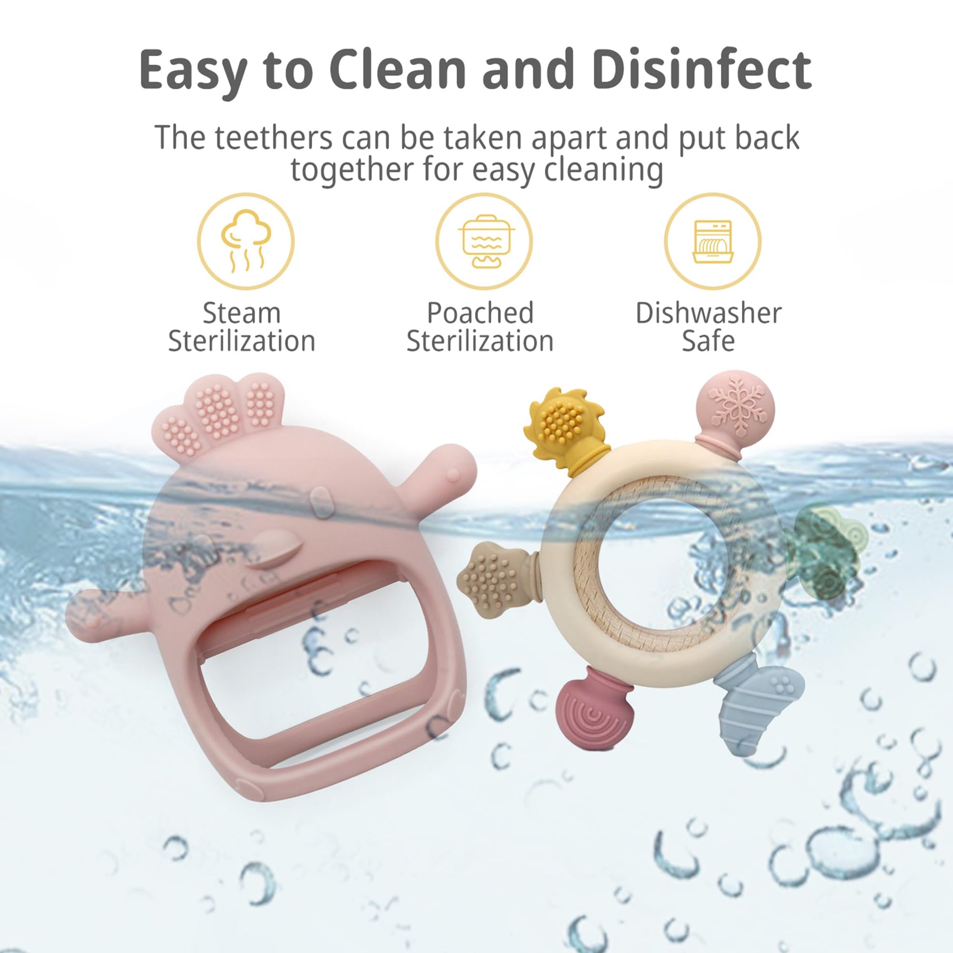 - Easy to Clean: Our baby chew toys are designed to resist dust and hair, keeping them clean and safe for everyday use. They can be sterilized in boiling water, placed in the dishwasher, or chilled in the freezer. After each use, simply rinse with warm water perfect for busy parents.