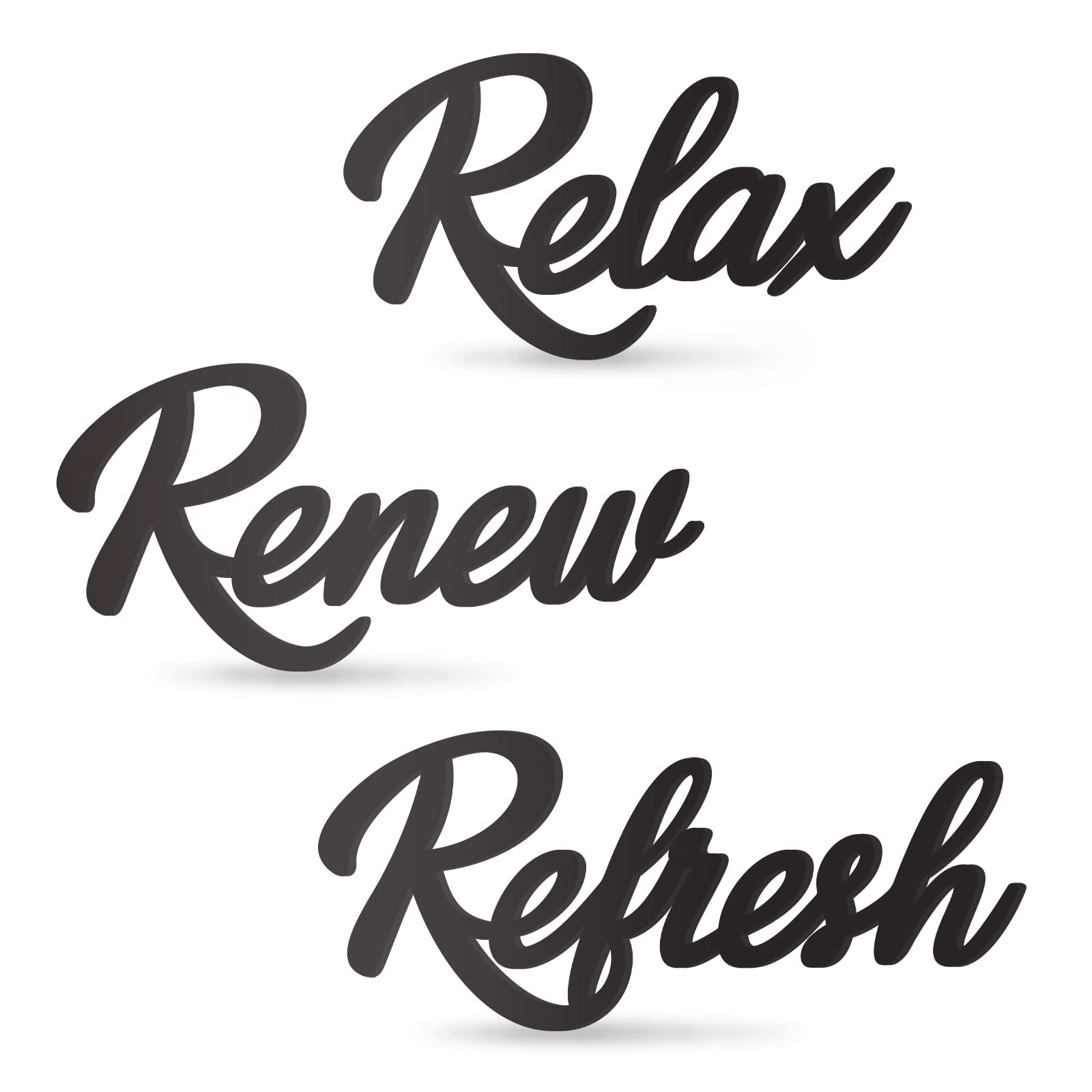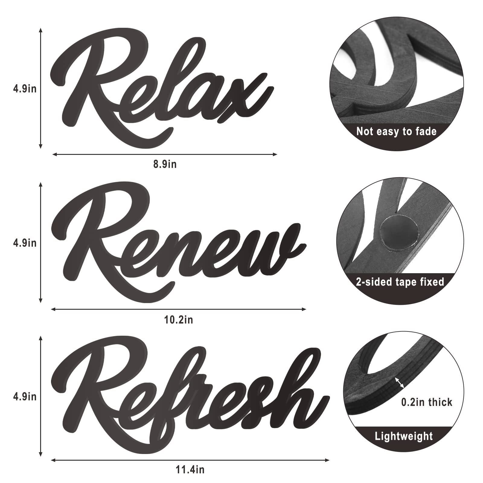 - Appropriate size: These signs décors are different sizes, the ' Relax' sign measures approx. 22.7 x 12.4 cm/8.9 x 4.9 in, the 'Renew' sign is about 25.8 x 12.4 cm/10.2 x 4.9 in, and the 'Refresh' sign is about 29 x 12.5 cm/ 11.4 x 4.9 in, they are suitable to add charm for your bathroom.