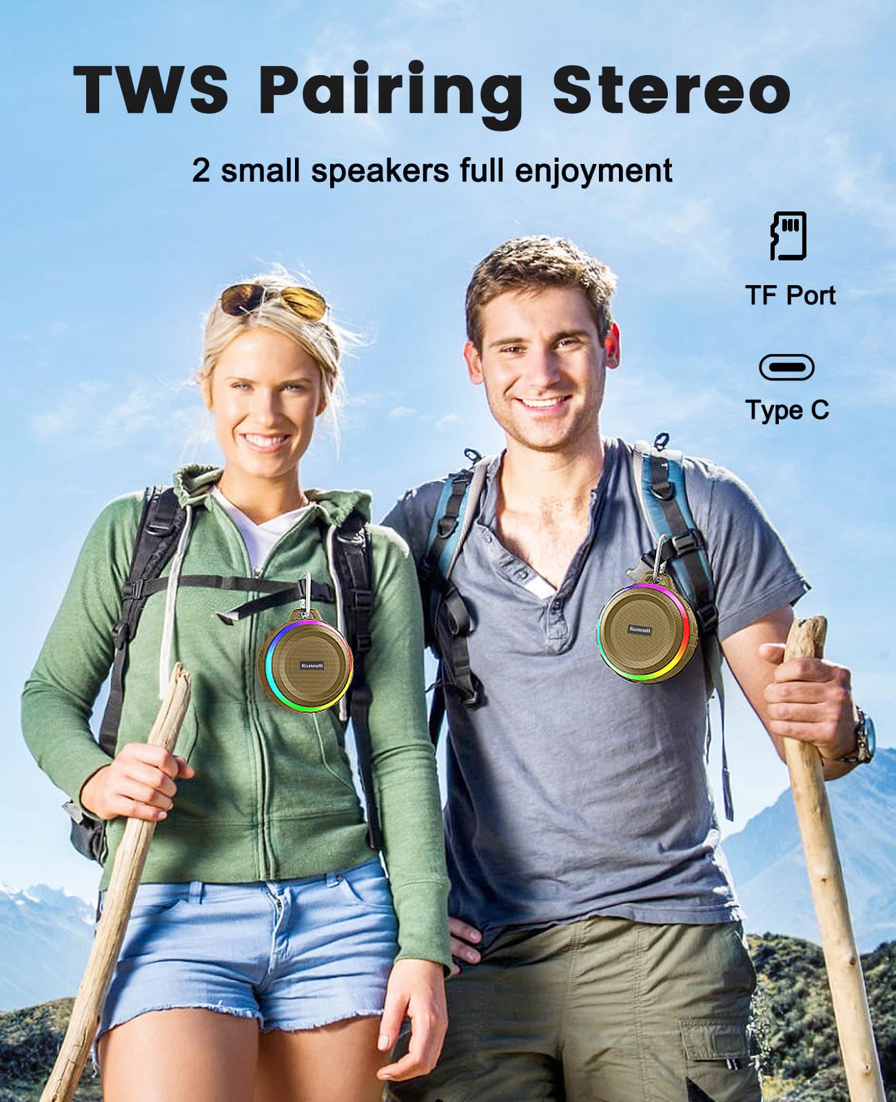 - Double Crisp Stereo Sound: Absolute 5W×2 loud stereo sound without distortion. Wireless speakers perform powerful sound by pairing 2 speakers together. Sounds great out of water.