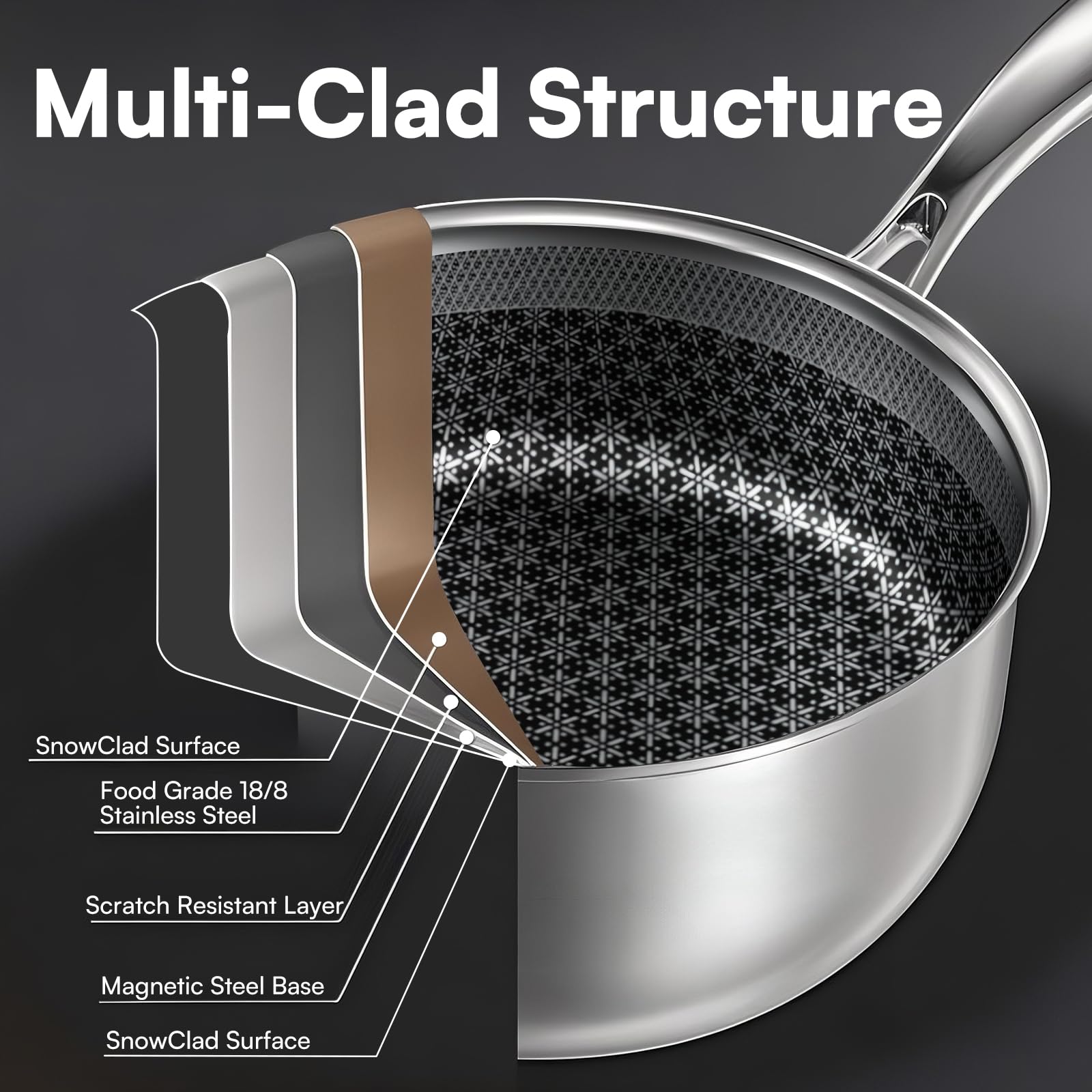 - Non-Stick Coating – Featuring a cutting-edge enhanced nonstick coating with a snowclad surface design, our non stick frying pans set offers longer-lasting, superior non-stick performance. Enjoy effortless all your need with our advanced non-toxic, Stainless Steel Cookware Set-safe pots and pans set non stick.