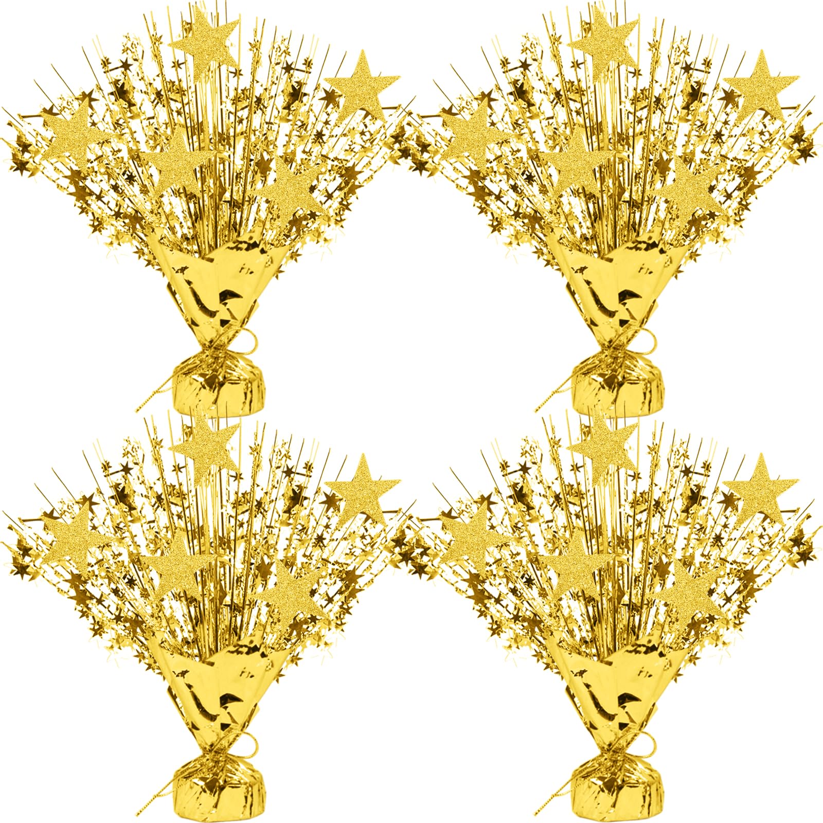 - You will get 4 pcs gold foil spray centerpieces with extra 16 glitter stars, adding more elegant and sparkle to your event, perfect for your home party decorations. These foil spray centerpieces dimensions about 12.5’’ X 2.3’’.