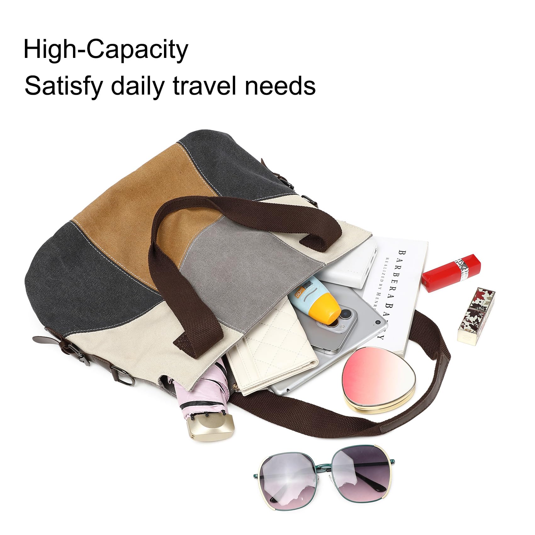 - Capacity: Women canvas tote bag can carry your mobile phone, wallet, cosmetic, iPad, books(A4), umbrella, keys, sunglasses, lipstick ,facial tissue and other daily things.