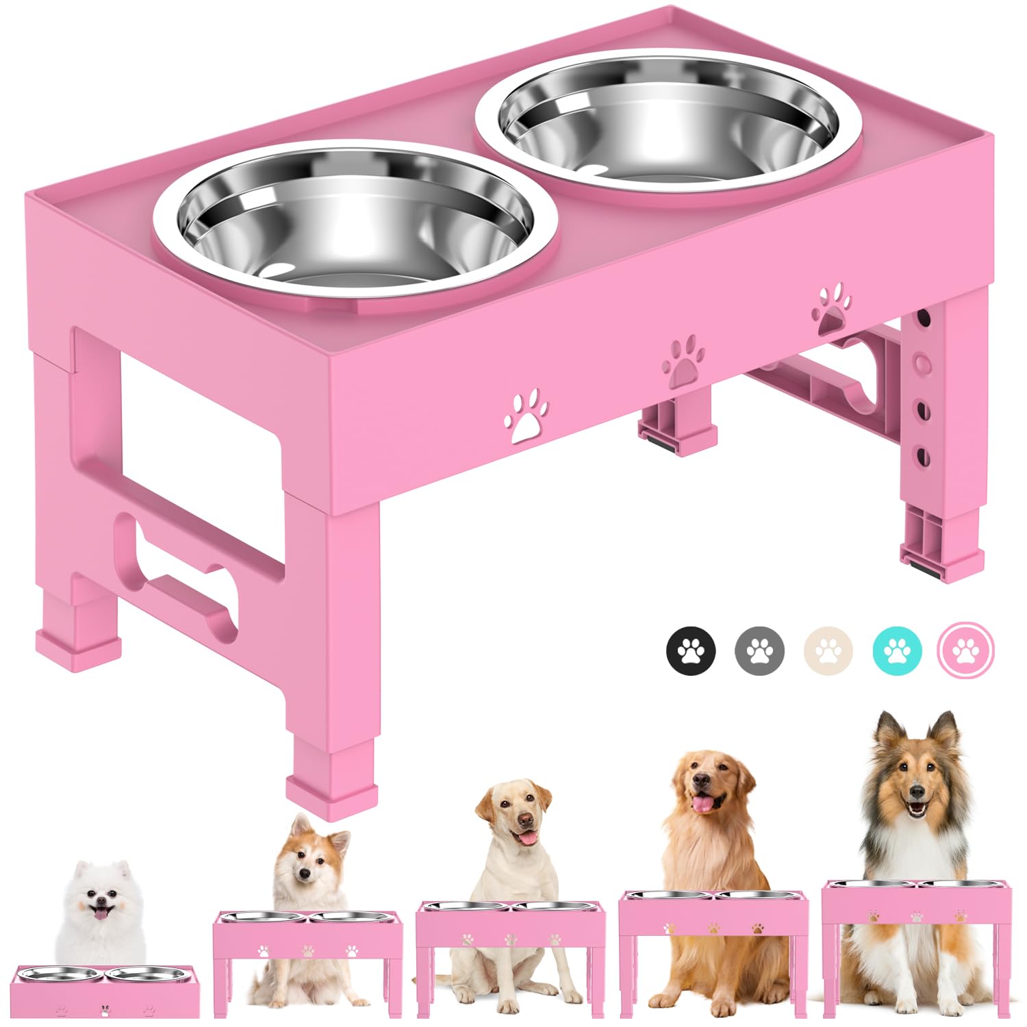 LAKIPETN Elevated Dog Bowls with 2 Stainless Steel Bowls, Raised Dog Food Bowl Stand 5 Height Adjustable (3.1", 9", 10", 11", 12") Non-Slip Feeder Set for Medium and Large Dogs - Pink