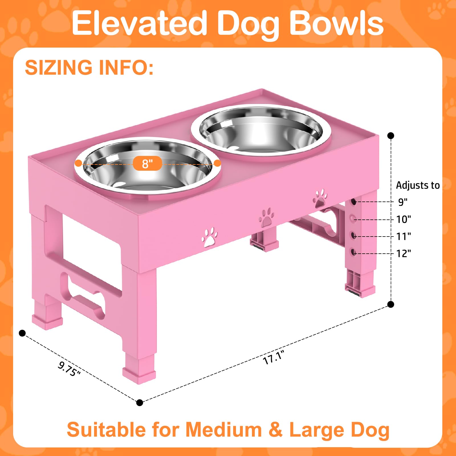 - đžăAdjustable Height Dog Bowl Standă:Say goodbye to bending down! Our elevated dog bowl stand offers 5 adjustable heights: 3.1', 9', 10', 11', and 12' to perfectly fit dogs of medium large sizes. The raised design ensures easy and comfortable access to food and water while preventing dust and floor debris from entering the bowls, guaranteeing a cleaner, healthier dining experience.