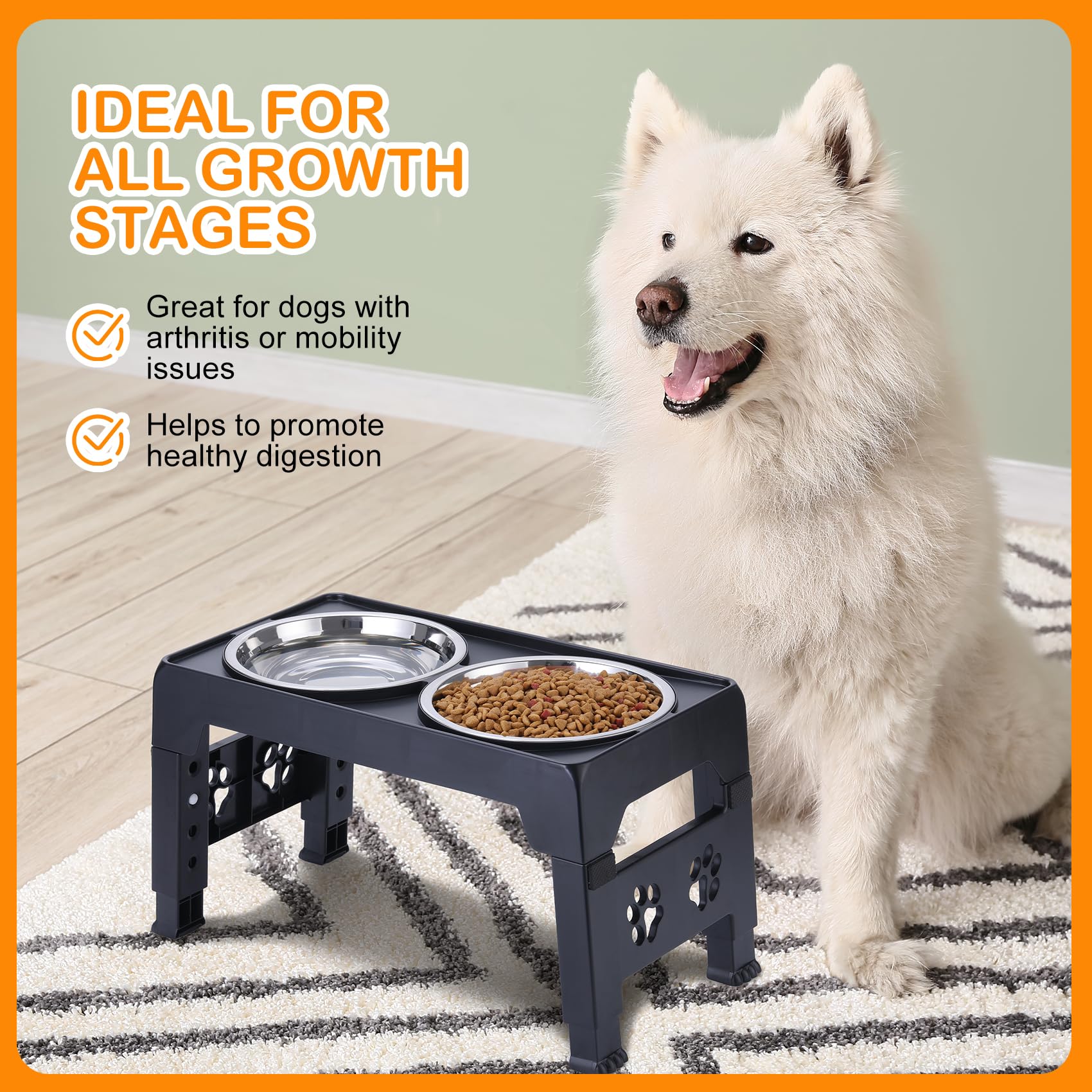 - Adjustable Dog Bowl Stand with Five Heights: This raised dog bowl adjusts to five heights for small medium large dogs more easily and comfortably to access their food and water, reduce strain on their neck and back, accompany them from puppy to full grown
