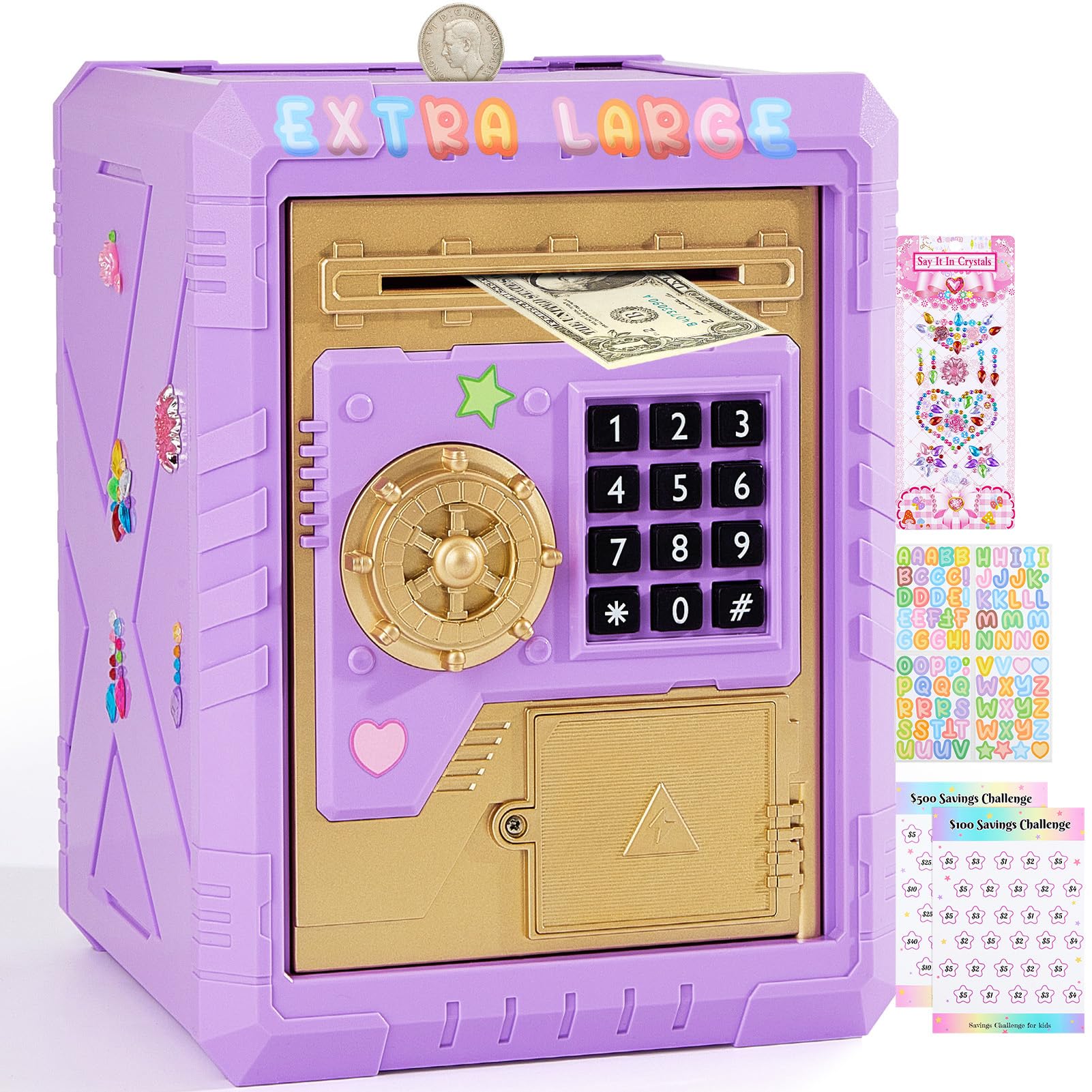 Large ATM Piggy Bank for Kids Electronic Bank with Password Lock, Safe Coin Bank for Boys and Girls Cash Savings Box for Children, Purple