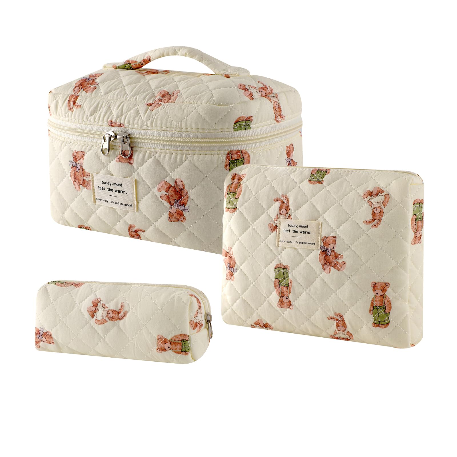Large Quilted Makeup Bag for Women and Girls, Cute Coquette Floral Cotton Cosmetic Bag, Aesthetic Travel Organized Toiletry Bags (01Pink Bows)