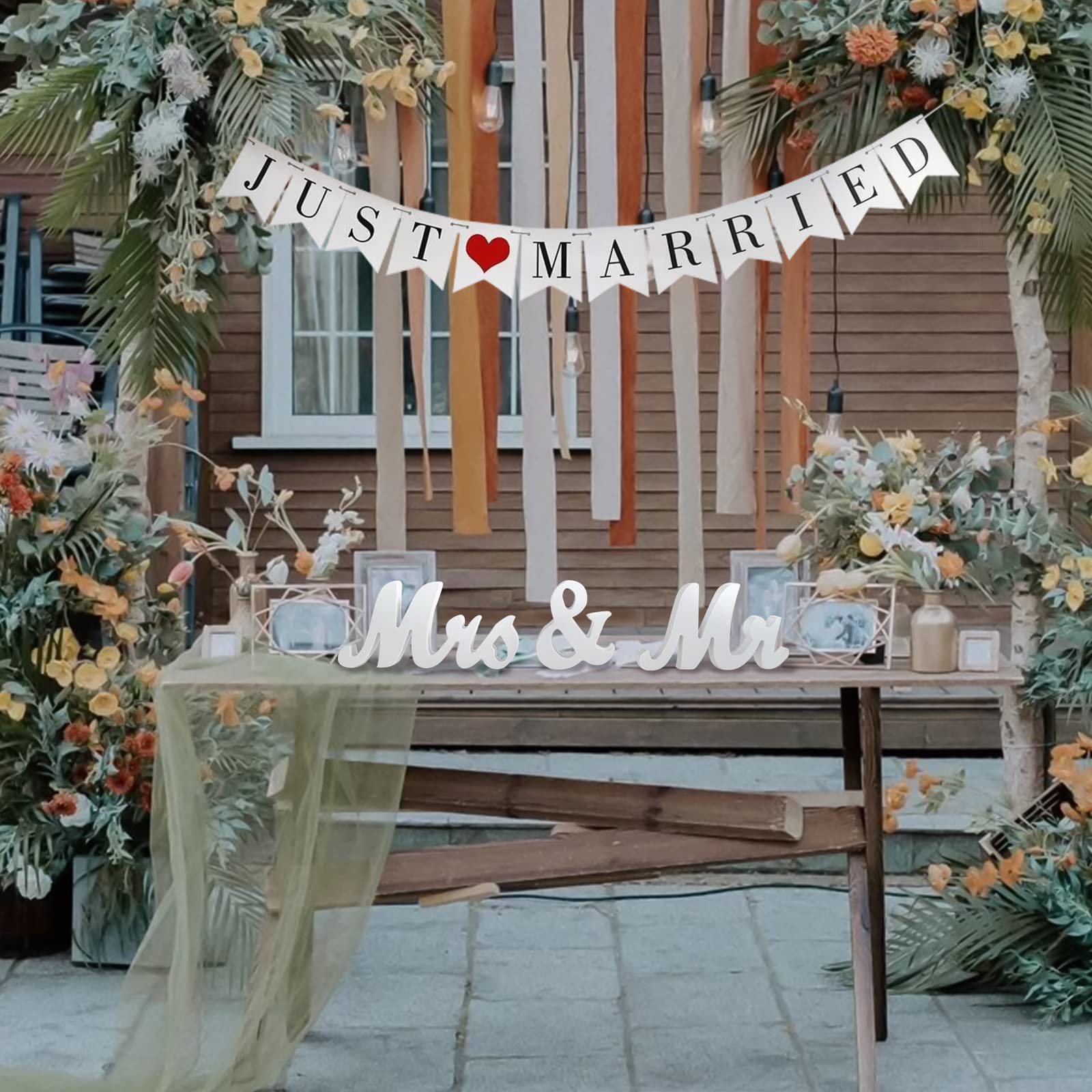 Large White Wooden Mr & Mrs Sign with Just Married Banner White Sweetheart Table Decorations & Photo Props for Anniversary Parties