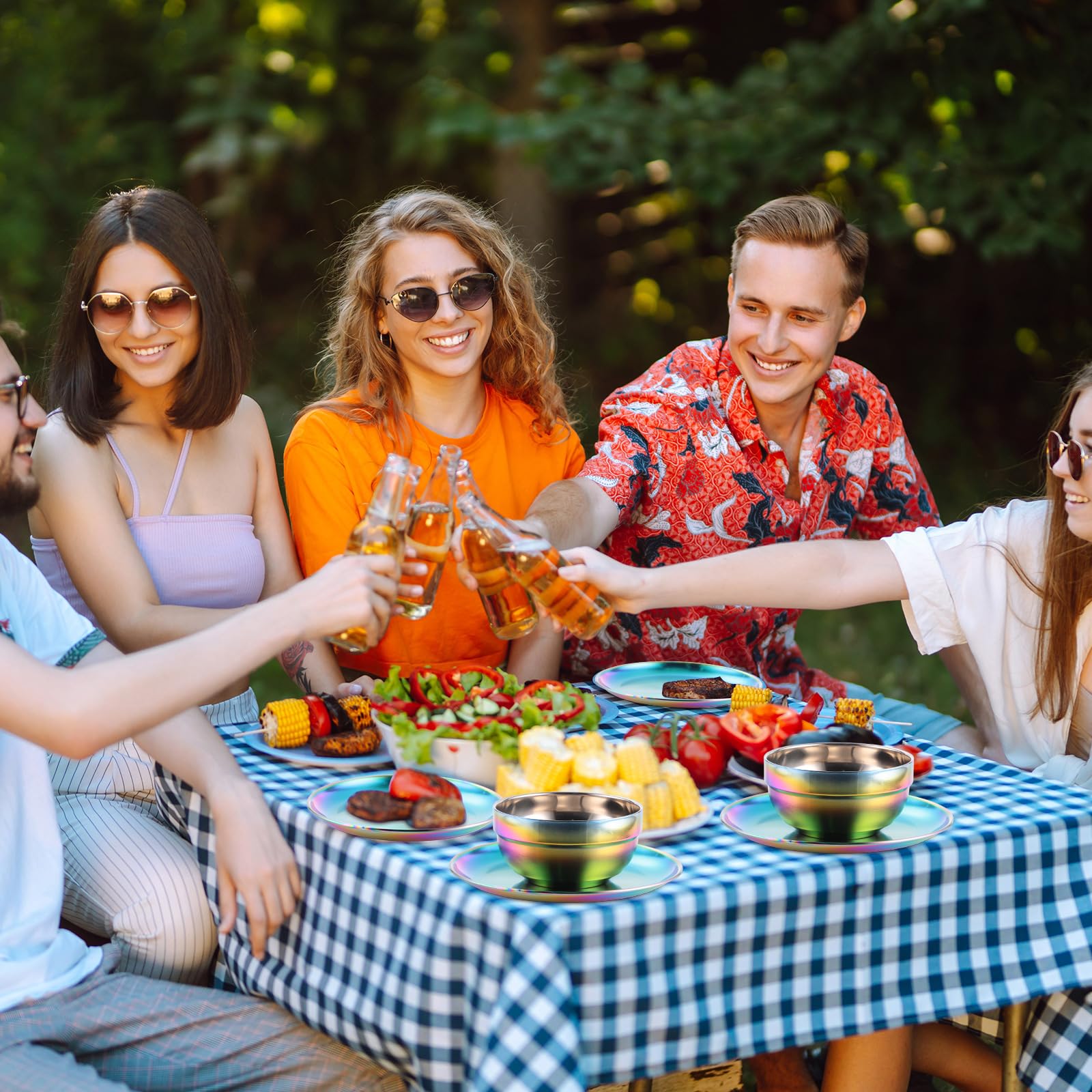 - Dinnerware Set: you will receive 30 pieces of rainbow stainless steel dinnerware set, including 10 dinner plates in 8 inch, 10 dinner bowls in 5.1 inch, and 10 cups in 3 inch, plenty of quantity, whether you are hosting a party or enjoying a quiet family dinner, or camping and picnicking, this rainbow dishes set ensures you're always prepared, with the plates, bowls and cups all in standard sizes for a variety of dishes and drinks
