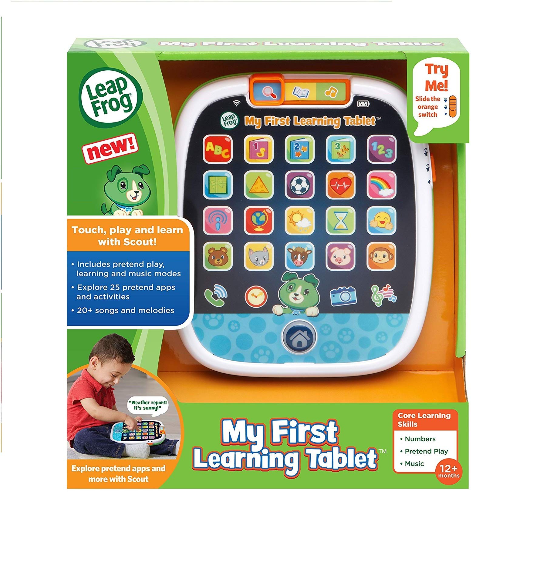 Details: Tap, swipe and experience a learning light show with My First Learning Tablet. This kid-tough toddler tablet feels like mom and dad's with a home button and 20 app icons that introduce letters, numbers, shapes, animals, colors and more. Five icons on the bottom of the tablet include phone, clock, violet button, camera and music player for role-play excitement. Tap the apps in explore, learn or music modes for a variety of playful activities. Press the animal apps to learn fun animal facts, choose the 123 and ABC apps to explore numbers and letters, learn colors with the rainbow app and more! every button lights up and activates a unique pattern of lights, colors and sounds. Touch and slide fingers over the screen and the little tablet will create special sounds and a Multicolor light show. Learn and play with violet and friends.
