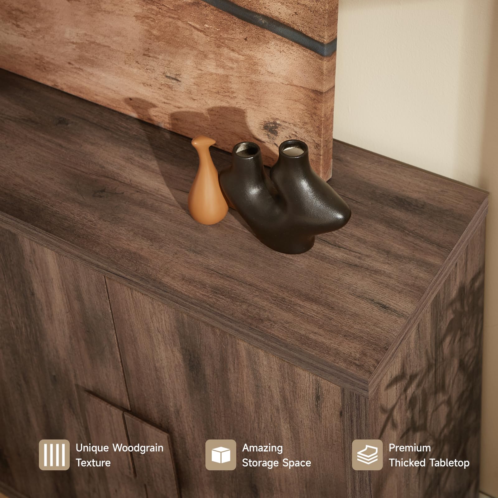 - Distinctive Woodgrain with Natural Character - Showcasing a one-of-a-kind textured surface featuring organic speckles and knots, this sideboard highlights the raw beauty of rustic craftsmanship. Each panel tells a story of rustic authenticity through its textured patterns, making it a true conversation starter in your space