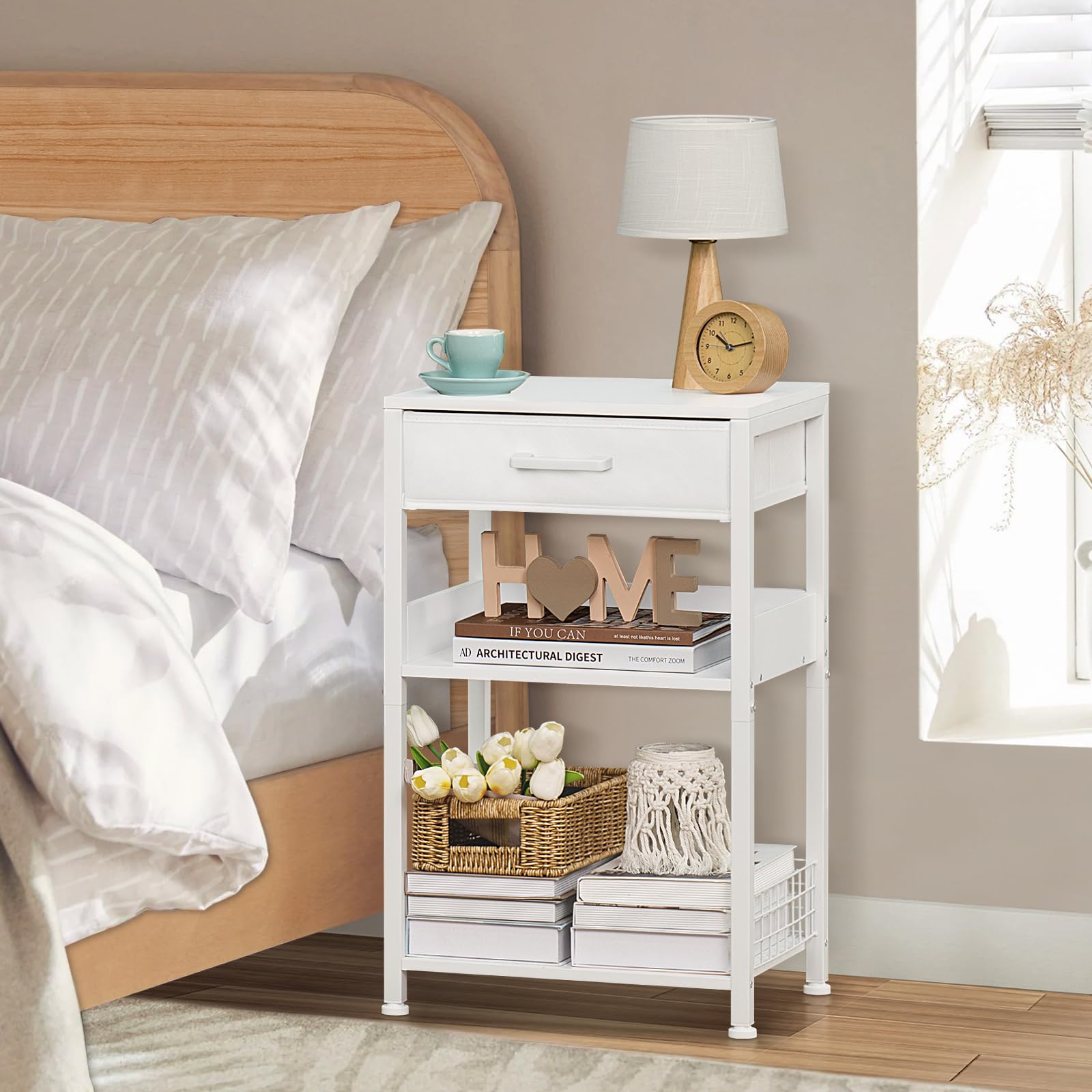 - [Industrial End Table] Modern pure white wooden boards & frosted metal frame,and with a fabric pure white fabric drawer come together to create this industrial-charming end table. This simple side table fit into a variety of room decor styles.You can put it in your living room or bedroom to make your room decoration no longer monotonous.