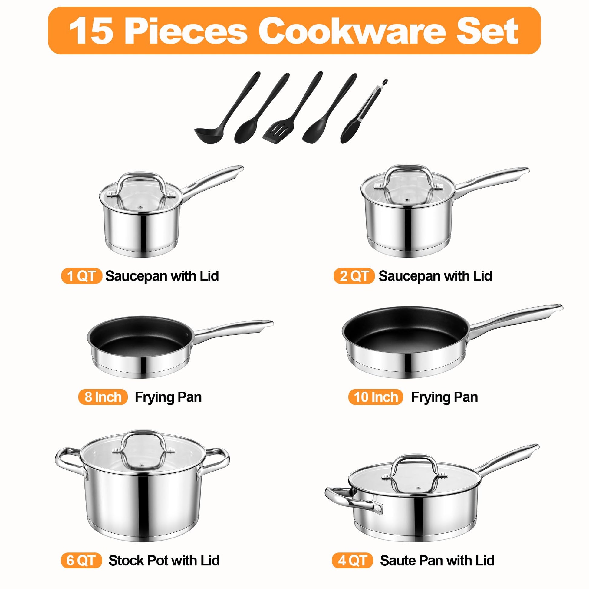 - Versatile cooking set: 15pcs stainless steel cookware set includes 8 inch nonstick frying pan, 10 inch non-stick frying pan, 4 QT non stick saute pan with lid, 6 QT stock pot with lid, 1 QT saucepan with lid, 2 QT saucepan with lid, plus additional 5-piece silicone utensils set of slotted turner, soup ladle, spoon, spatula spoon, tong, the multi-use kitchen cookware set is ideal for your daily cooking