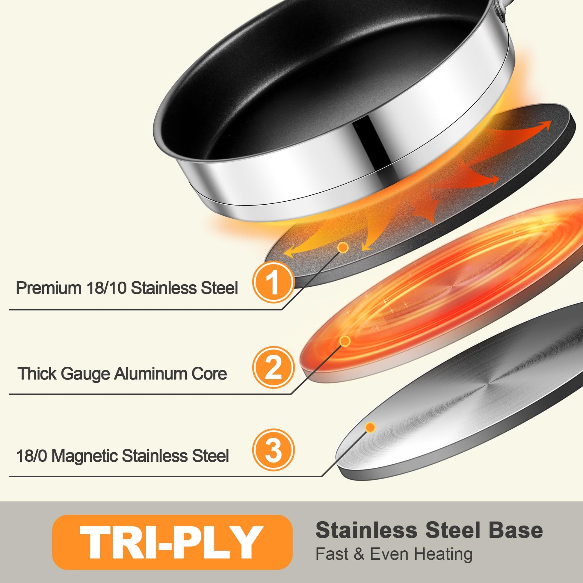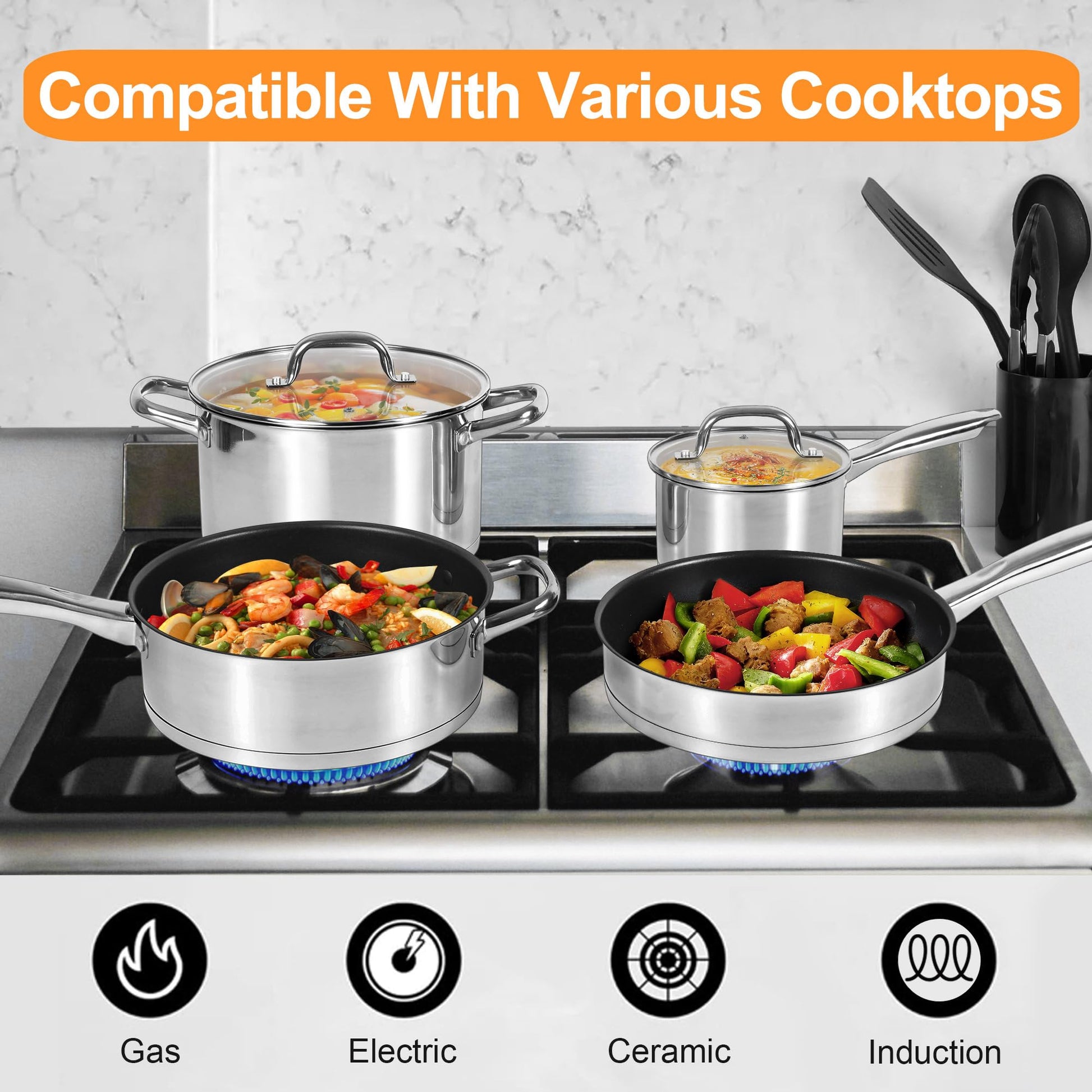 - Compatible with all cooktops: pots and pans set is equipped with tri-ply stainless steel base, thick gauge aluminum core heat up quickly and distribute the heat evenly, 18/0 magnetic stainless steel is conductive to allow the cookware set works well on all cooktops, including gas, electric and induction, oven safe up to 600°F for seamless transition from stove to oven, making the cookware set more functional and versatile