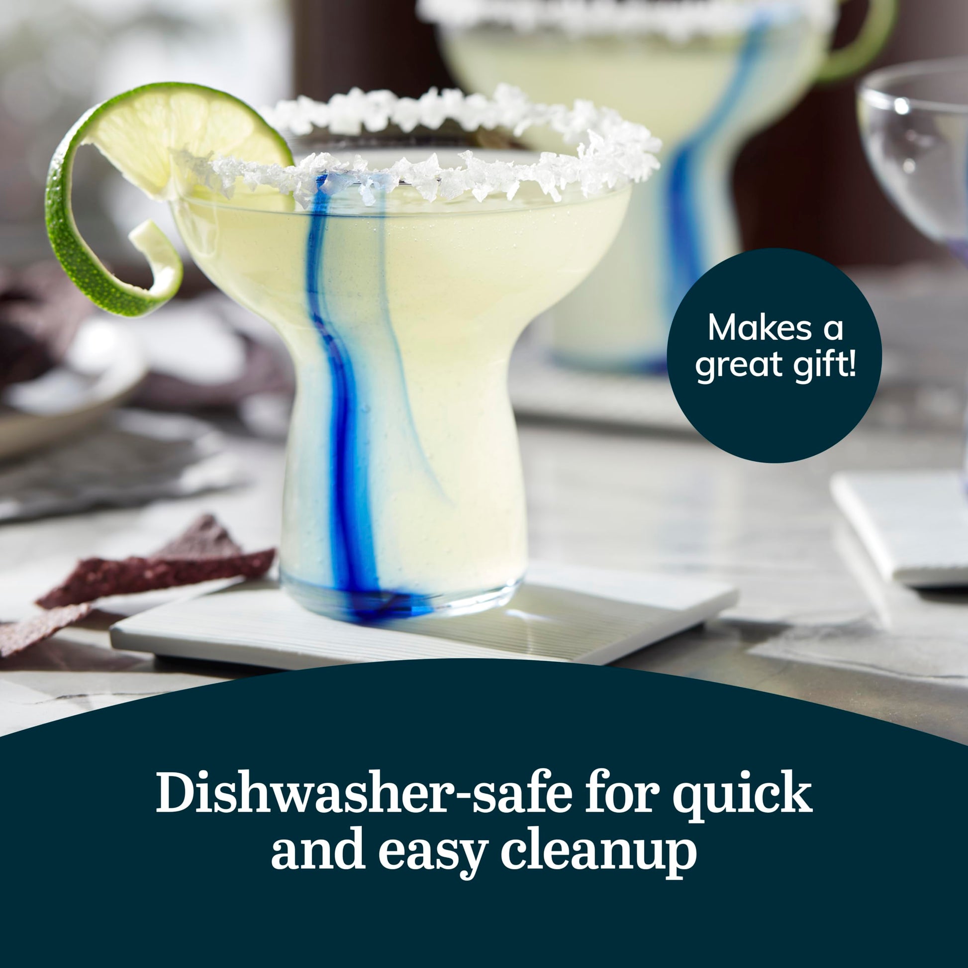 - Artisan Inspired Design: The wide rim of our cute margarita glasses is ideal for holding and serving your favorite margarita with salt, and our fancy glassware infused with an elegant artisan inspired blue streak also elevates dessert presentation