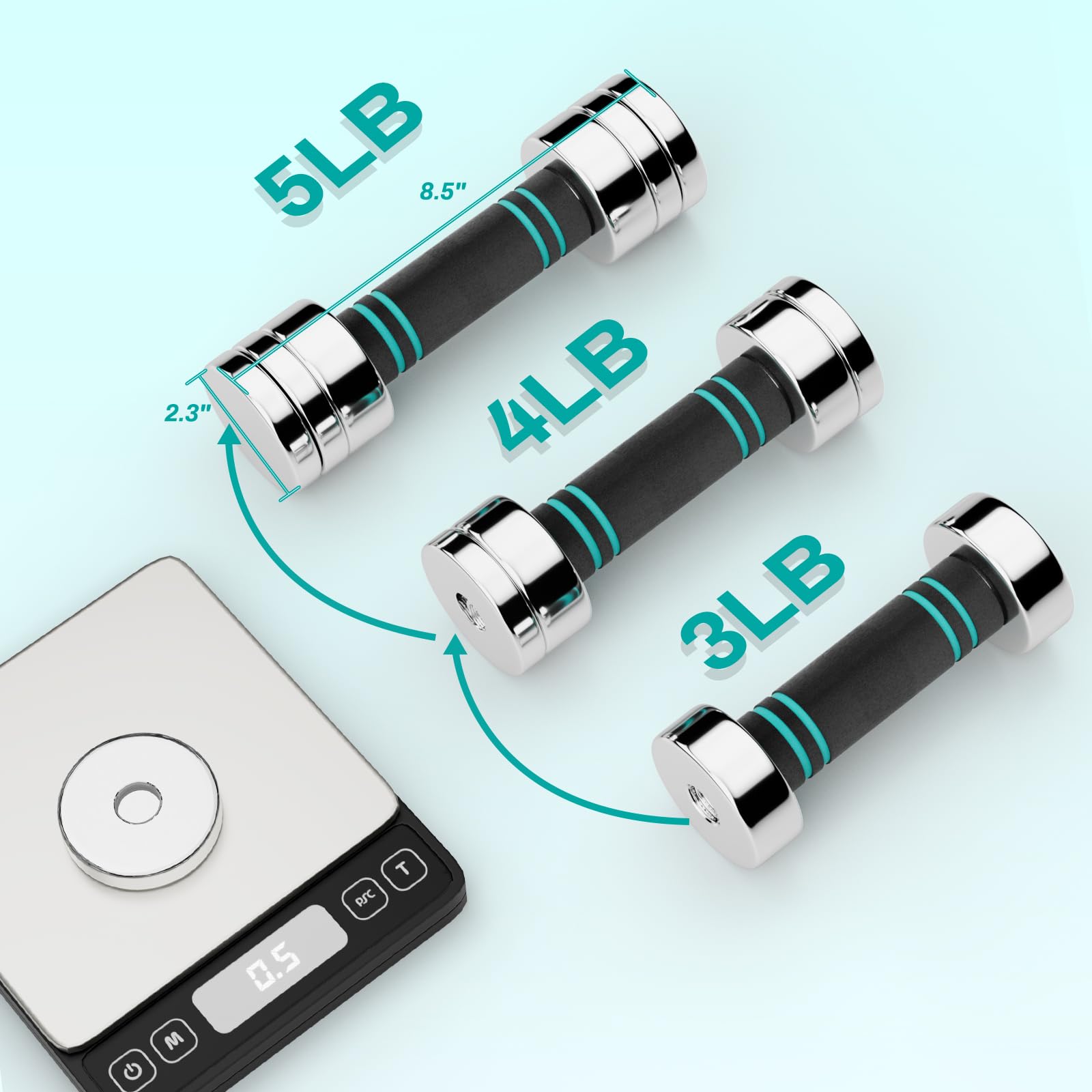 - Adjustable Dumbbell: A dumbbell can be adjusted to multiple weights. The 5 lb weights steel dumbbells are adjustable weights of 3 lb, 4 lb, 5 lb. The 10 lb weights dumbbells are adjustable weights of 5 lb, 8 lb, 10 lb. The 15 lb dumbbell are adjustable weights of 5 lb, 11.5 lb, 15 lb.