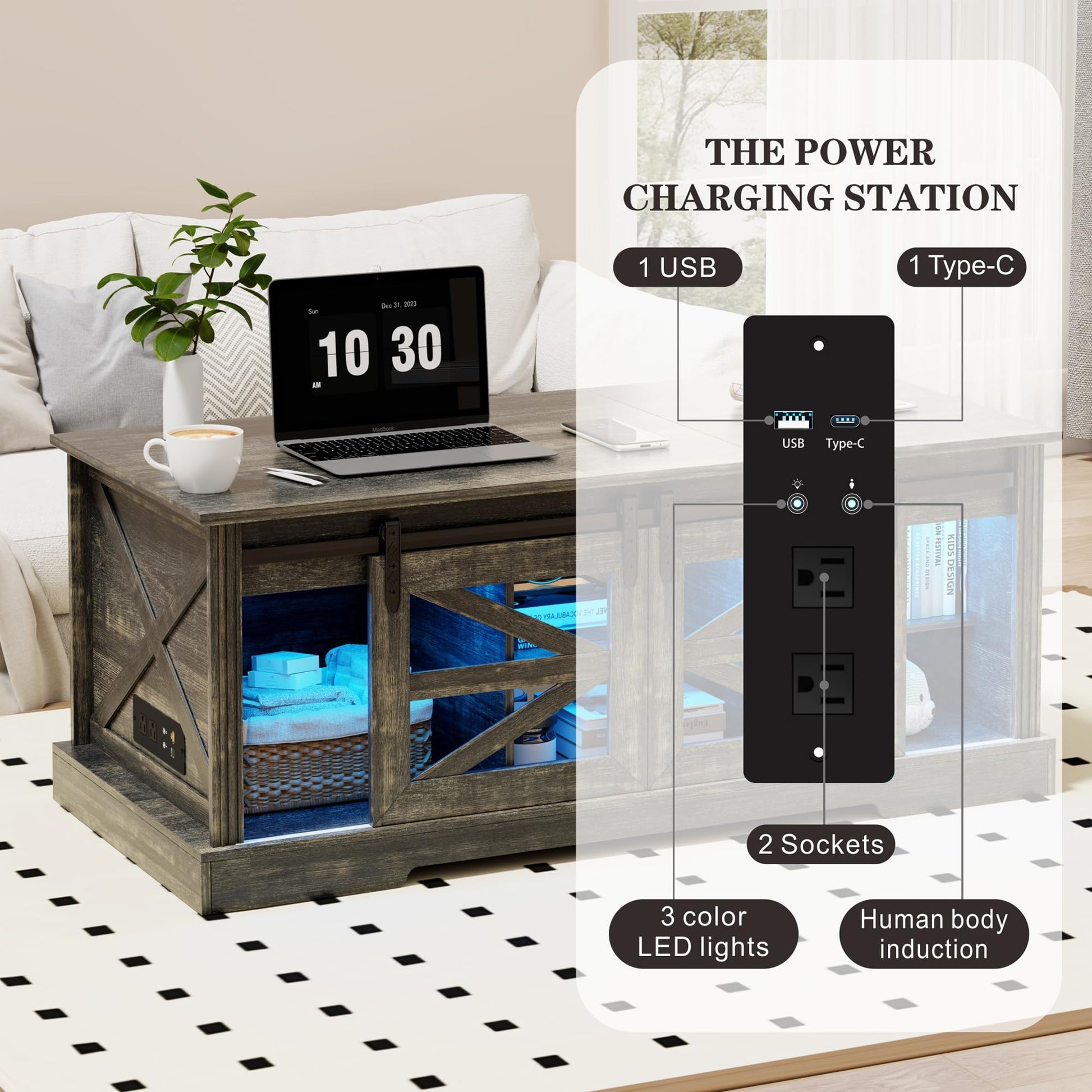- [Convenient multi-functional coffee table]:A powerful charging station, 1 USB and 1 Type-C, 2 sockets, also equipped with blue, yellow, white 3 colors LED light and human sensor. Open the light switch, continue to click the button to switch different lights, long press to adjust the brightness of the lamp